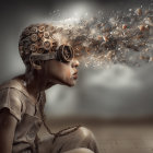A young boy sits in shadow, wearing a simple, buttoned shirt. His head is partially dissolving into a cascade of gears and fragments, blending human and mechanical elements in a surreal manner.