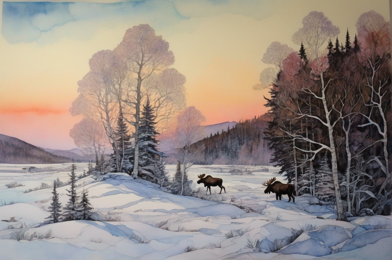 Prompt: The spectral world. More detail with pen; trees, moose and other salient details. Winter in my heart. A natural northern landscape with moose, Cold bleakness.