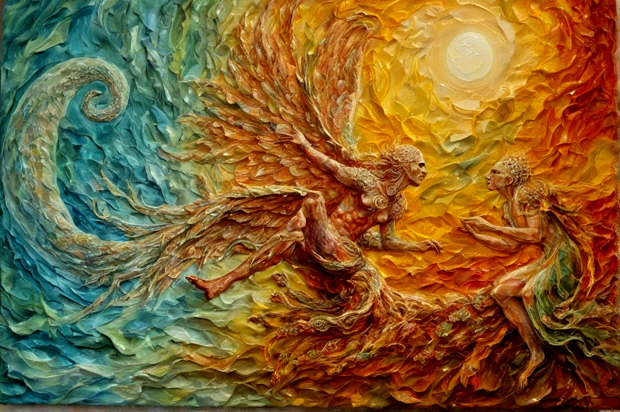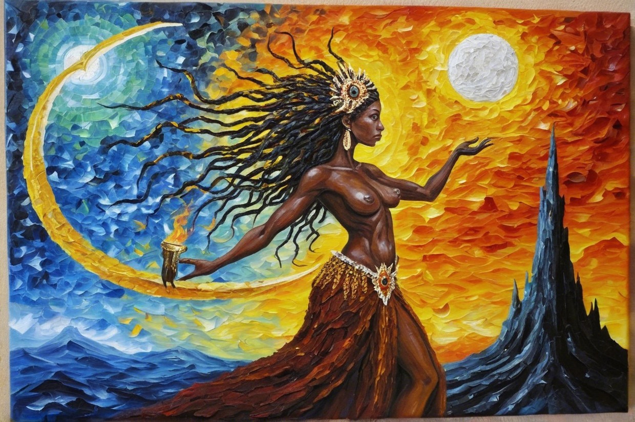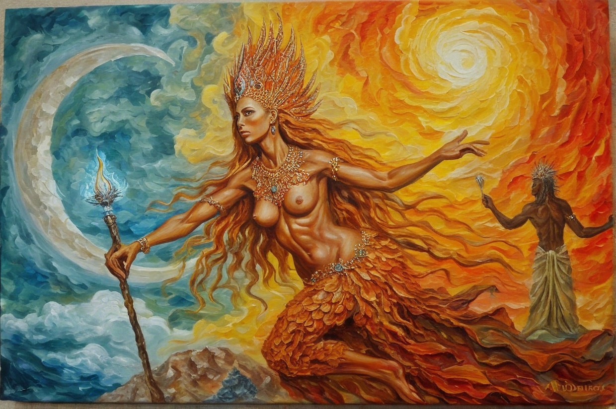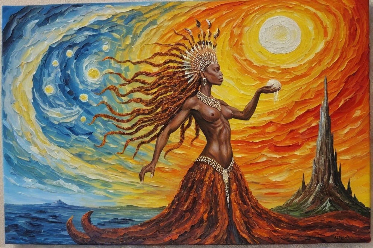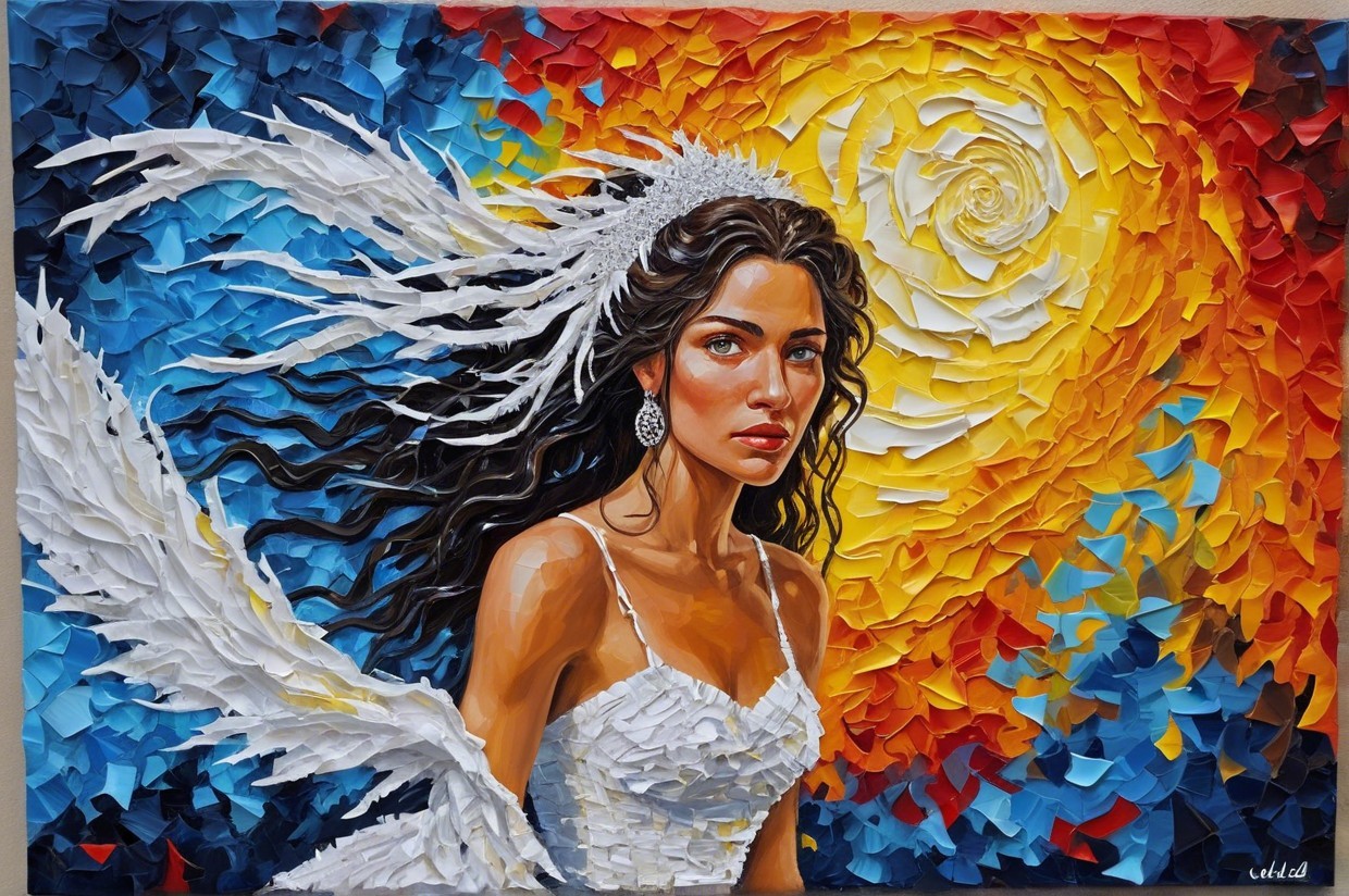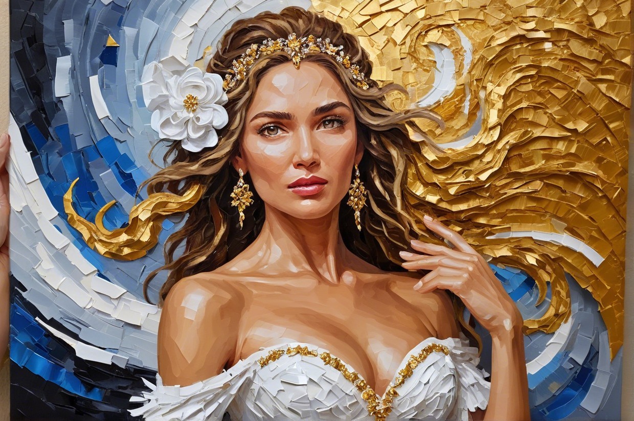 A stunning portrait of a woman with flowing curls, adorned in a white gown. She wears elegant gold accessories, set against a dynamic background of textured, swirling golden hues.