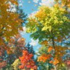 A serene woman in a yellow dress sits in a vibrant autumn forest, surrounded by colorful leaves and lush trees under a bright blue sky, radiating a sense of tranquility and nature's beauty.