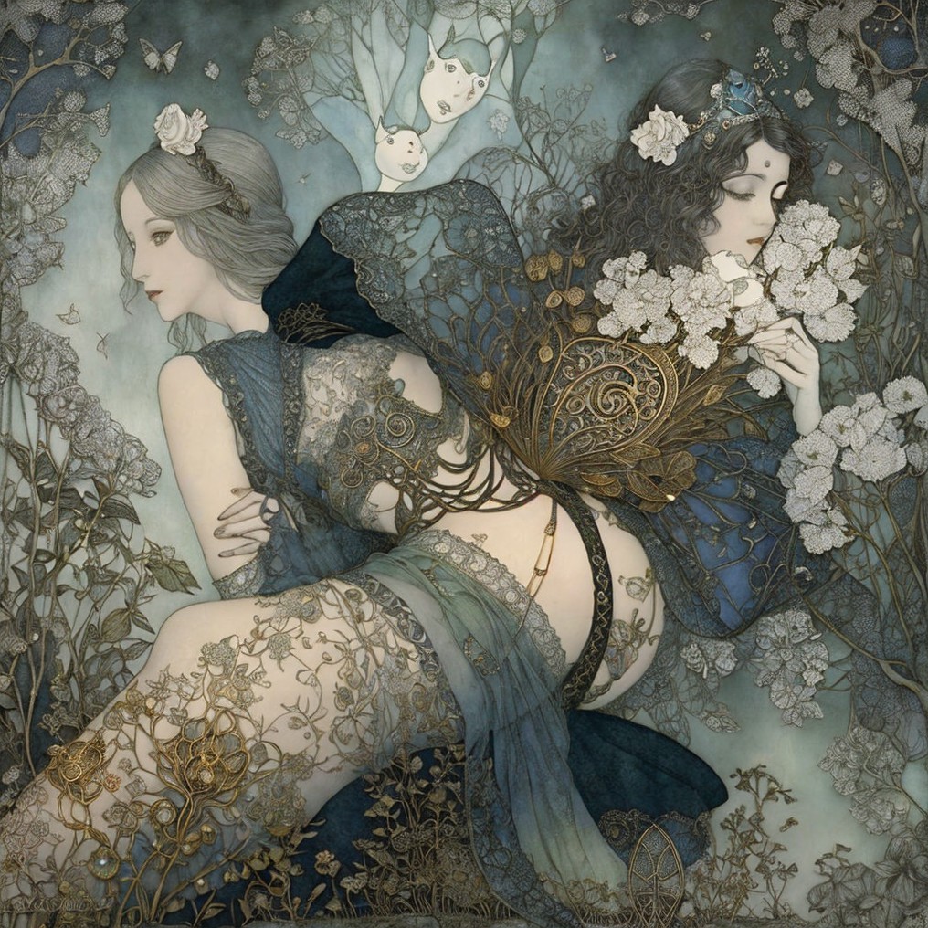 A serene figure with flowing hair sits amidst intricate swirls and floral designs, gazing thoughtfully. In the background, an ethereal landscape with a maze and distant castle adds a mystical touch.