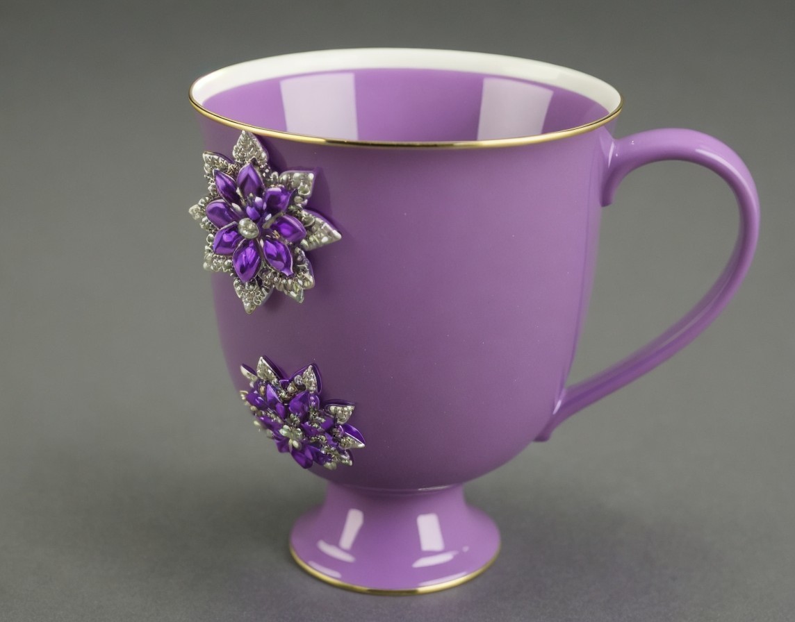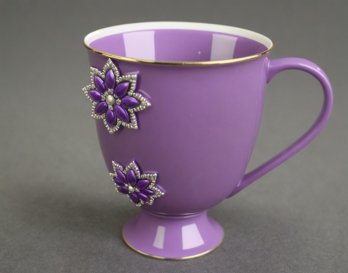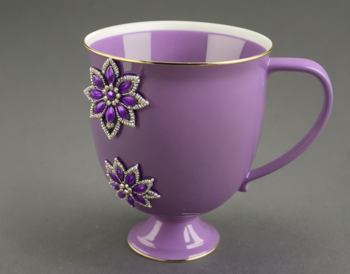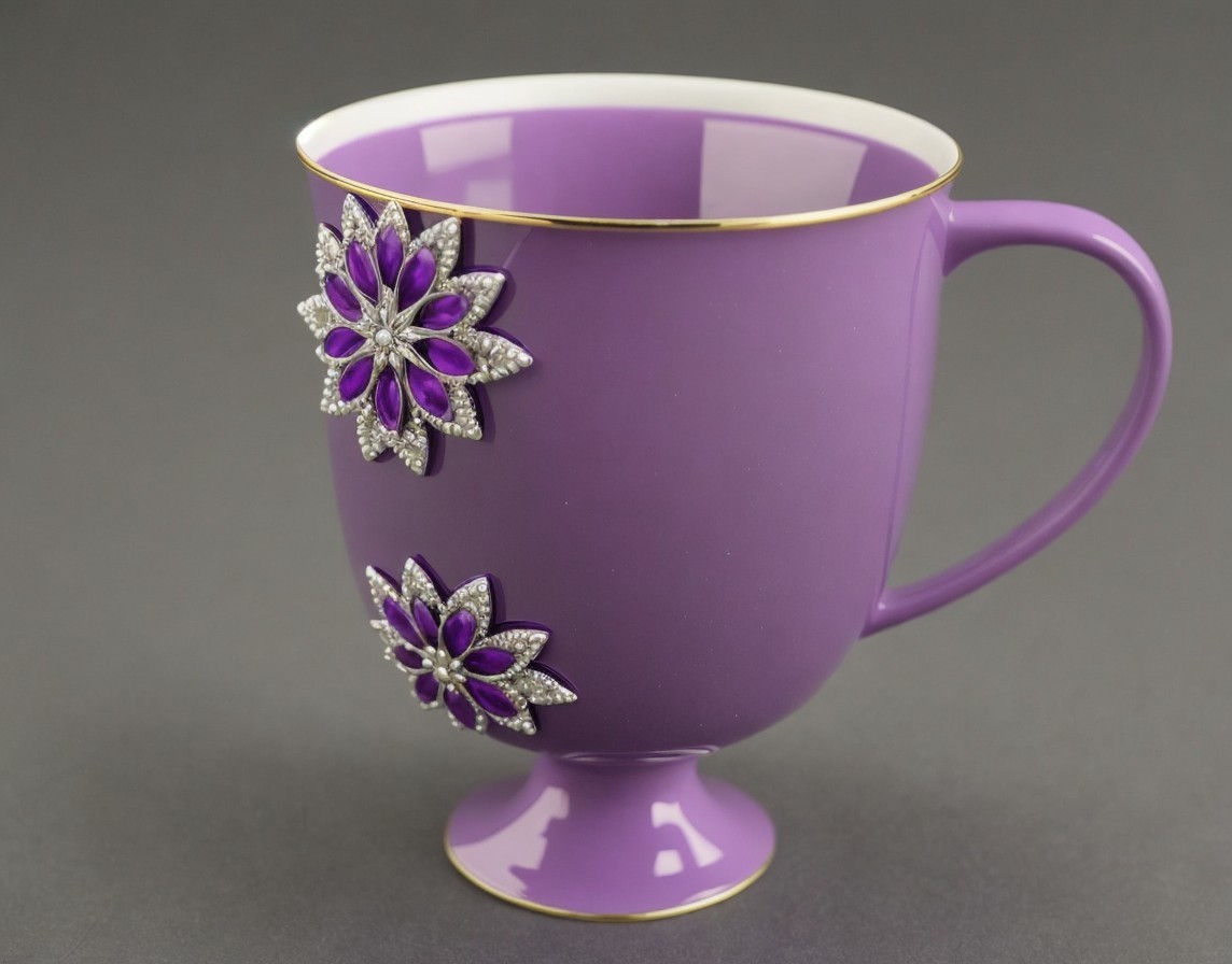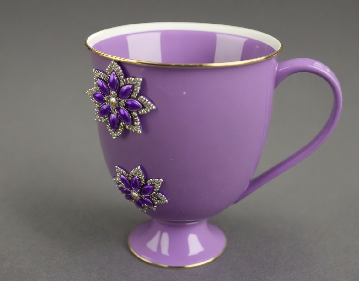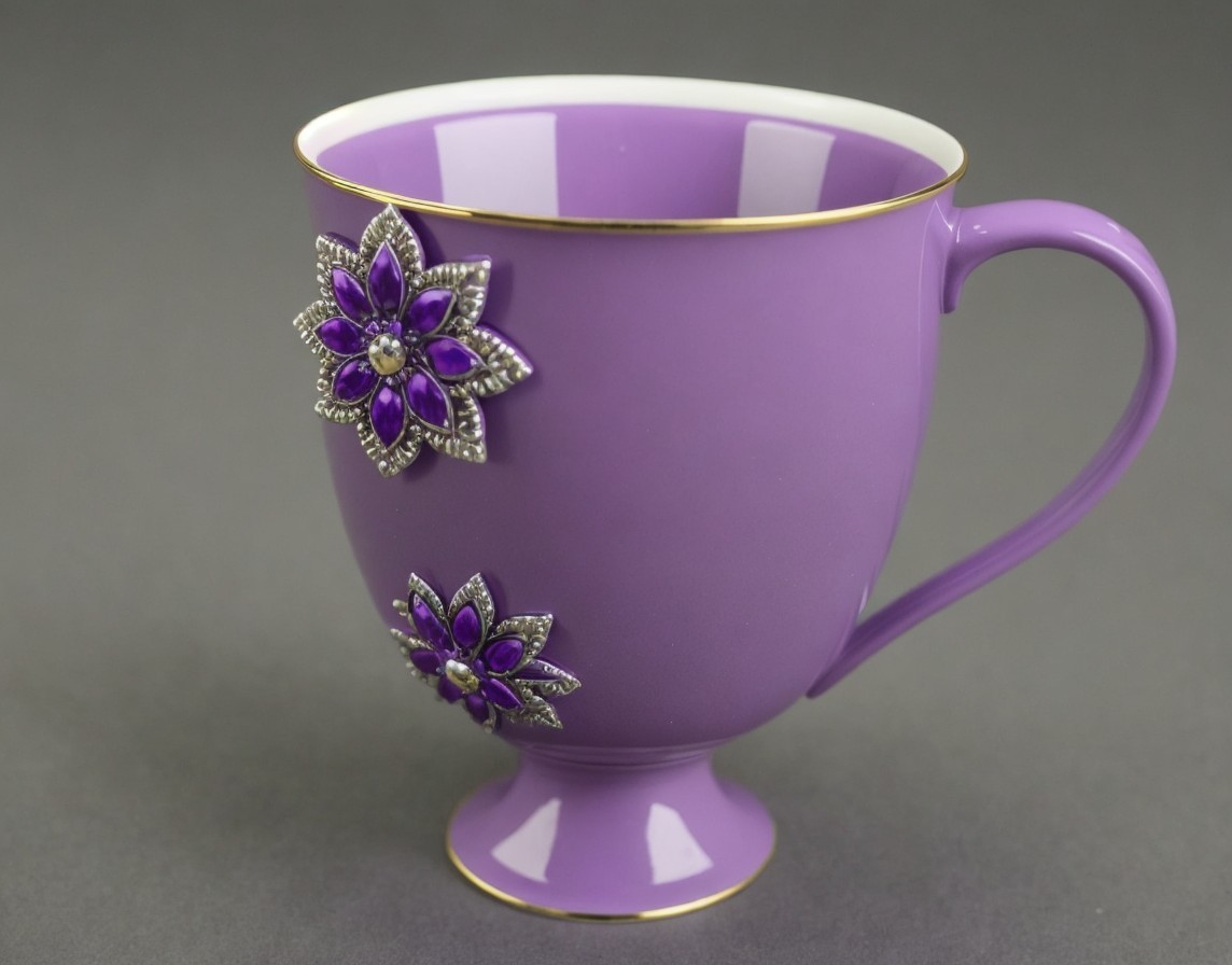 A purple teacup with a gold rim and jeweled flower embellishments on a gray background.