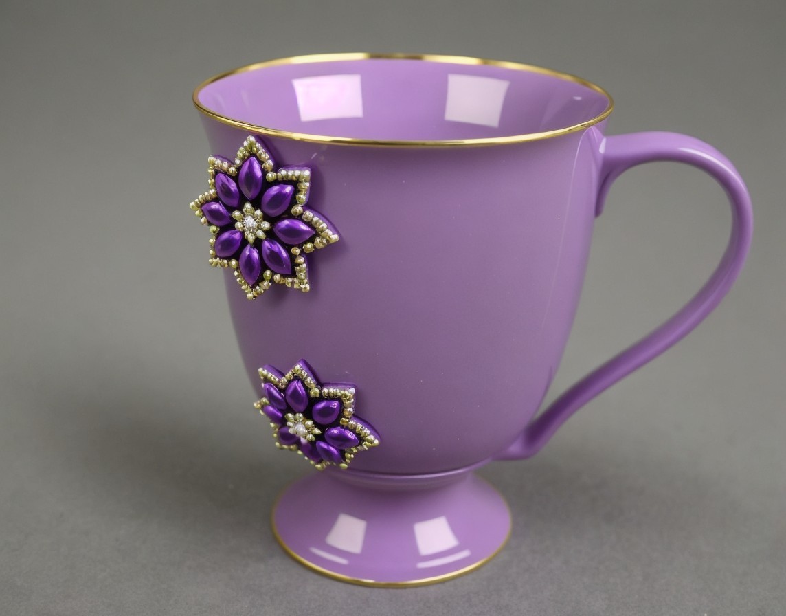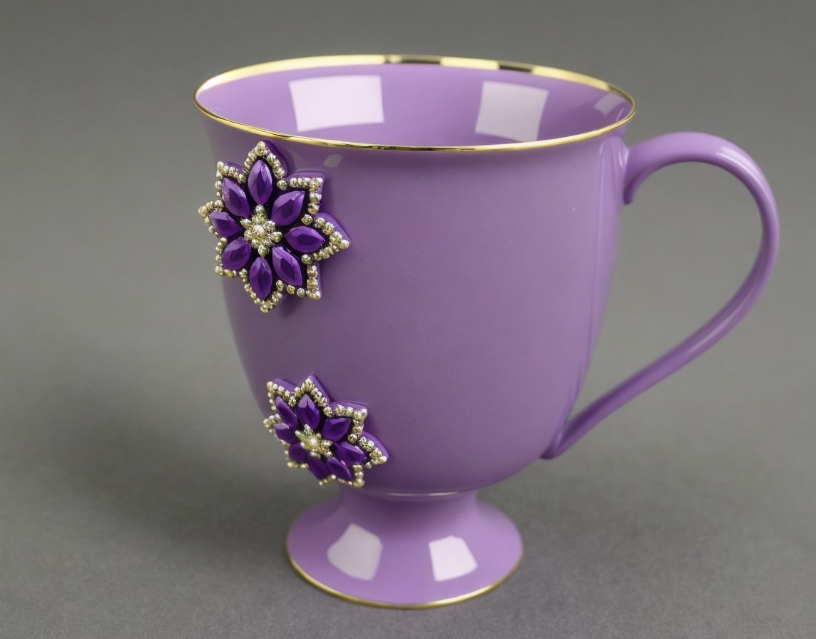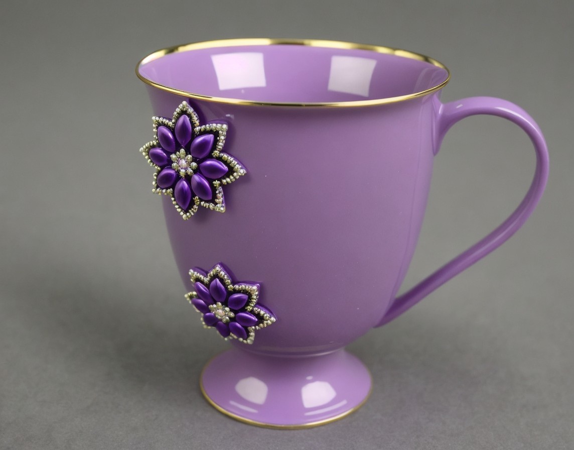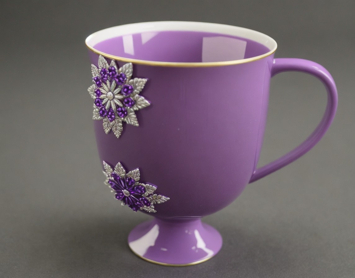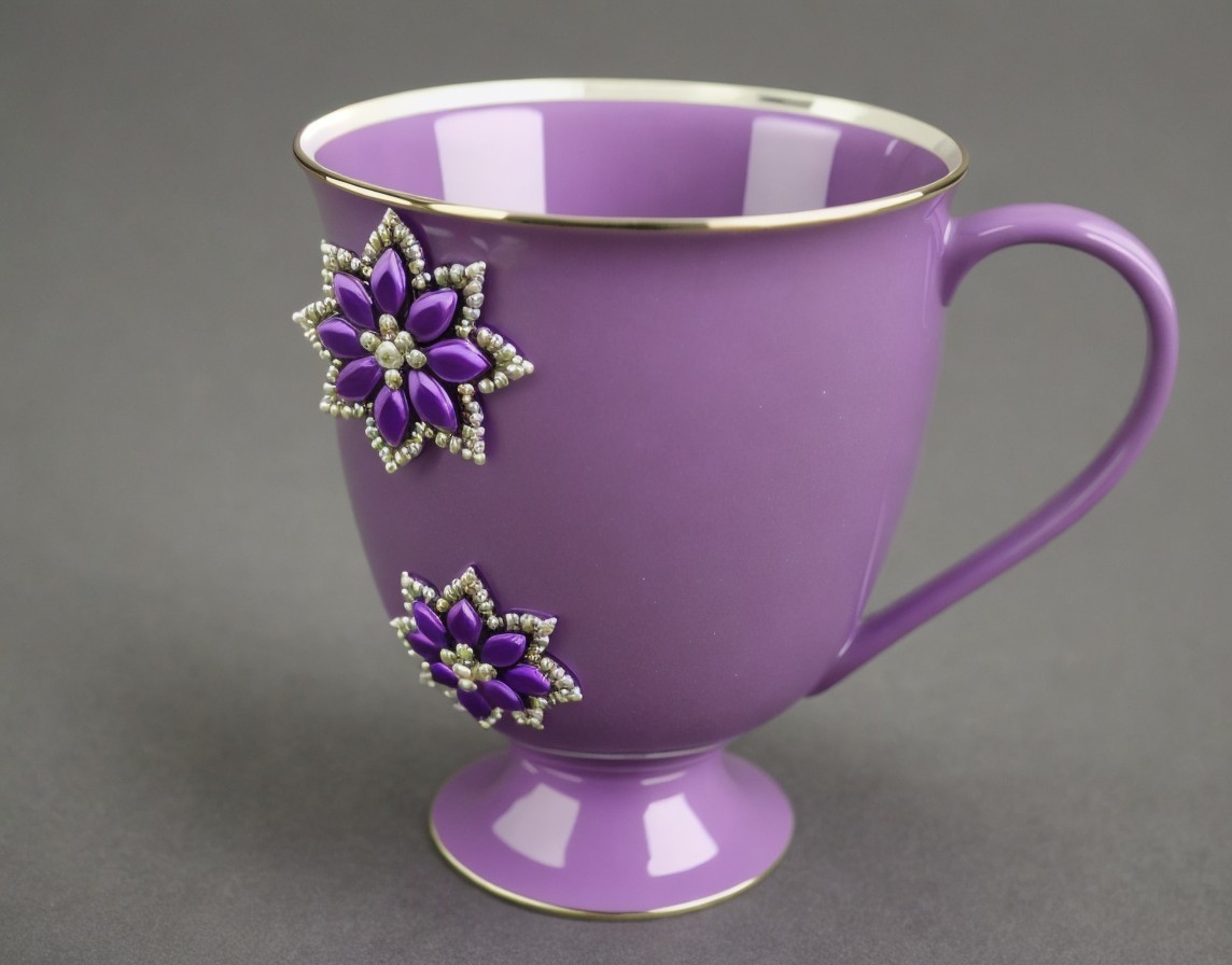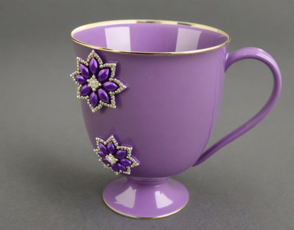 A purple teacup with a gold rim and jeweled flower embellishments on a gray background.