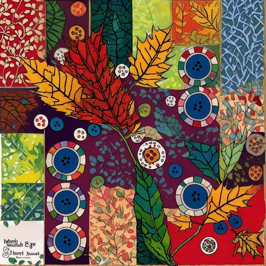 A vivid, colorful artwork depicting an abstract blend of autumn leaves and circular patterns with a mosaic-like quality.