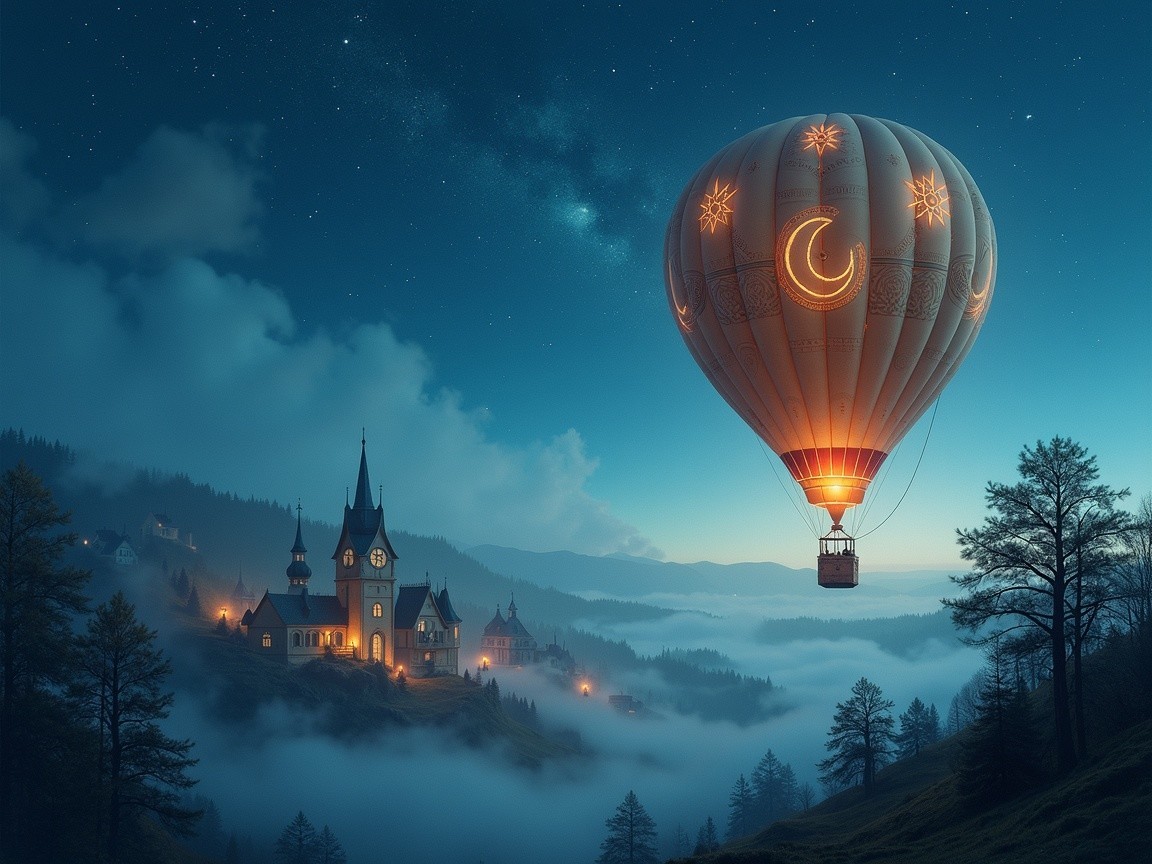 A breathtaking illustration features a glowing hot air balloon descending over a mystical village nestled among misty mountains. The balloon, adorned with luminous moon and star patterns, emits a soft, warm light that illuminates its intricate designs. Below, the village's structures, including a prominent clock tower, glow with interior lights