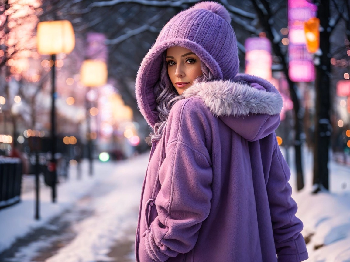 A young woman with curly pink hair, wearing a lilac-colored winter coat with a fluffy hood, stands on a snow-covered path, looking over her shoulder at the viewer. Her coat has a luxurious furry trim around the hood, and the coat itself is puffy and quilted with horizontal and vertical stitching
