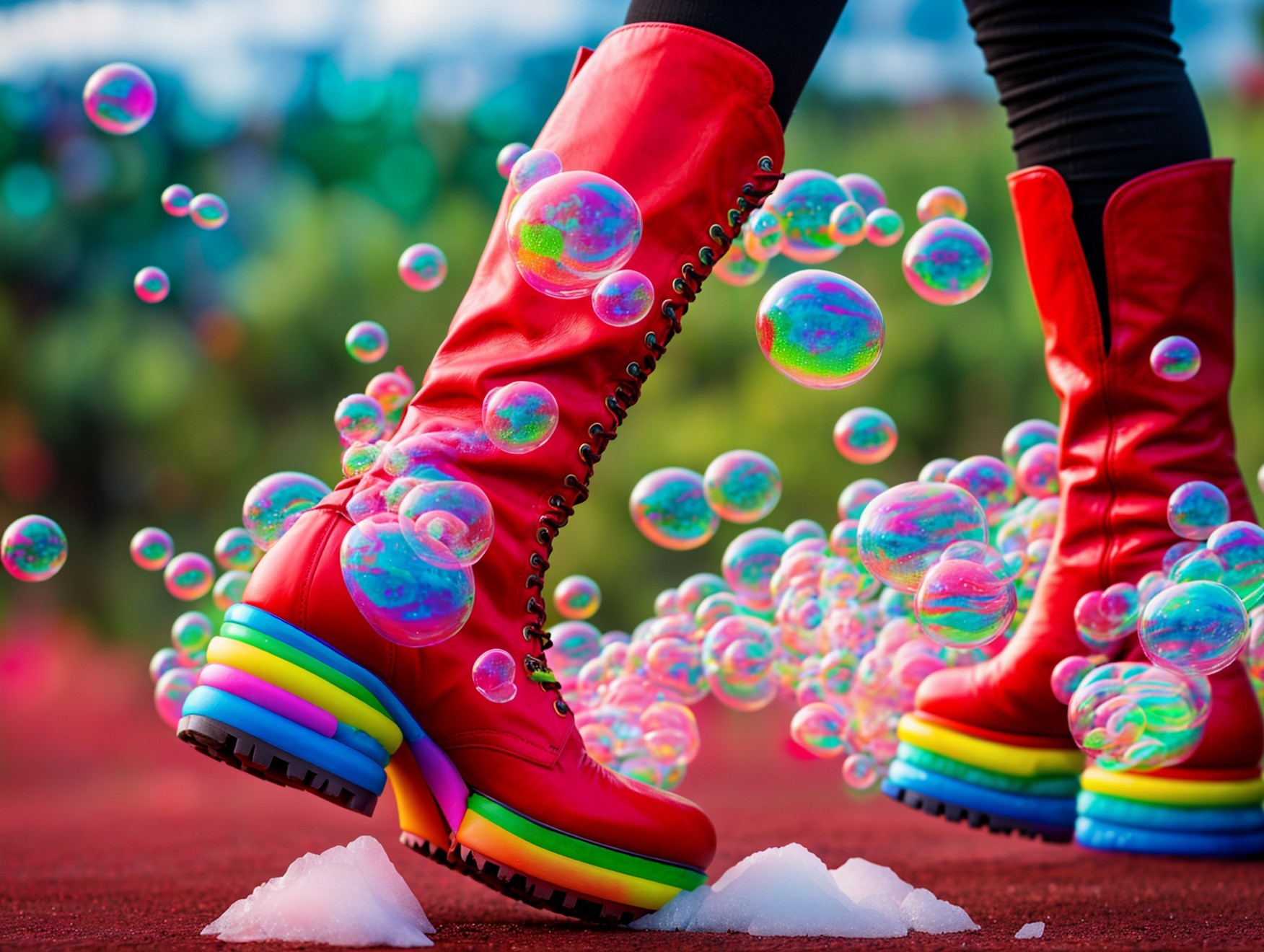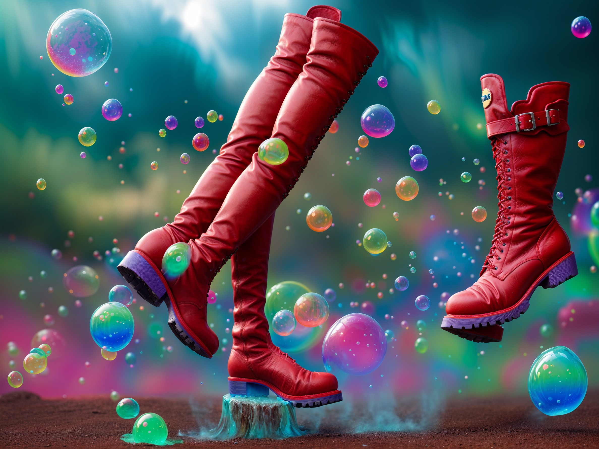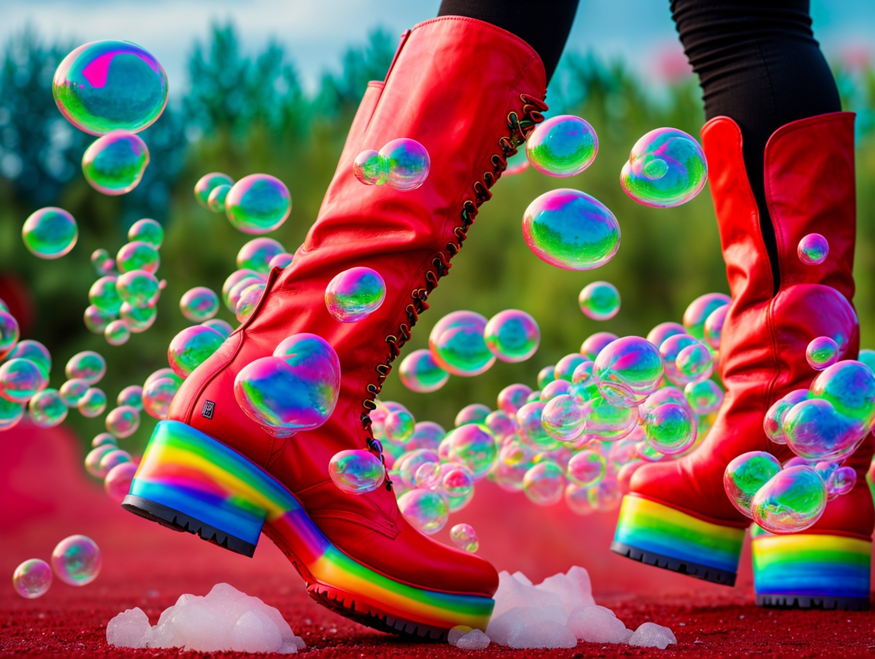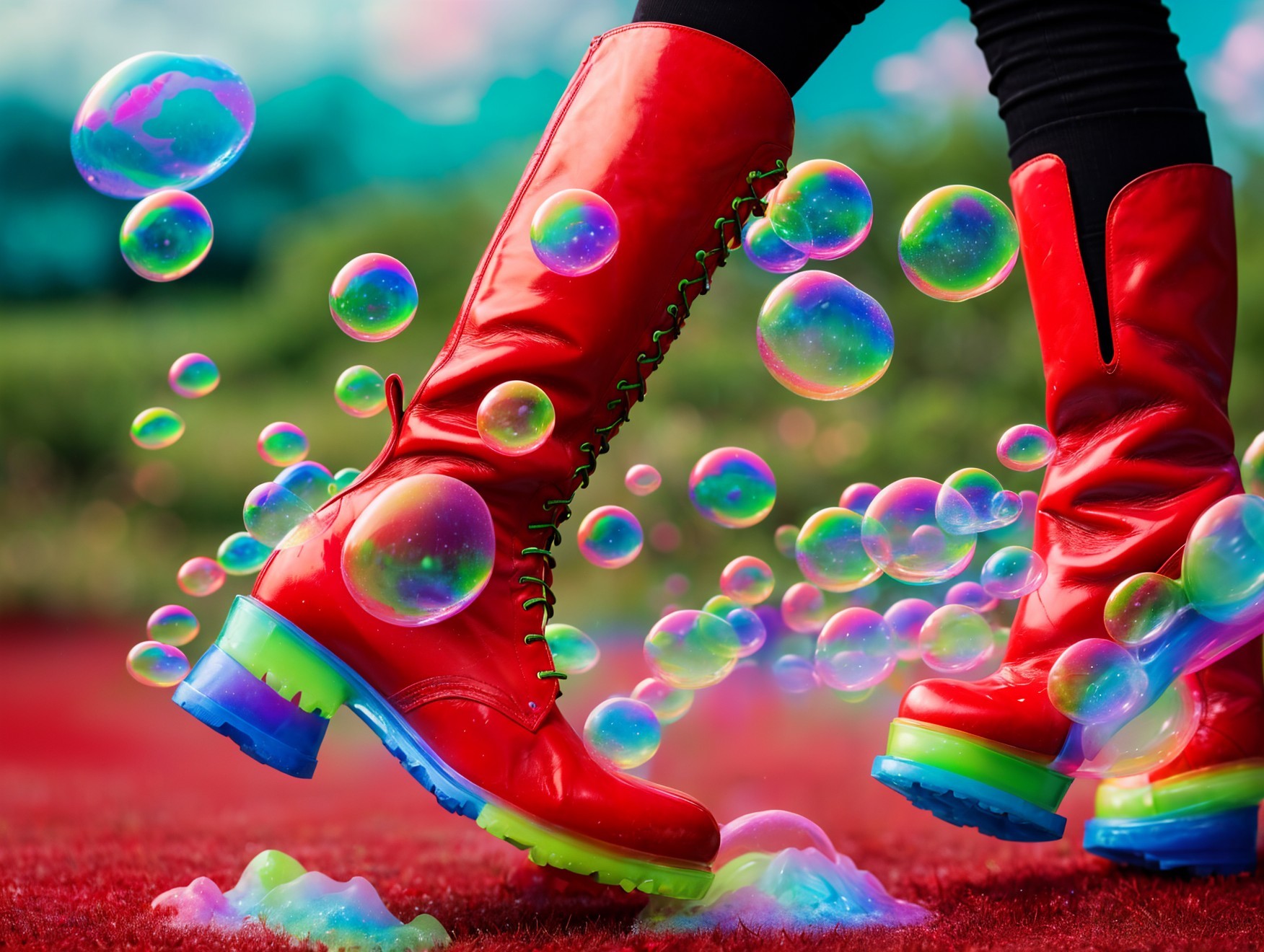 A whimsical scene featuring bright red boots and green socks, playfully immersed in bubbles against a colorful, smoky background with floating orbs, creating a vibrant, fun atmosphere.