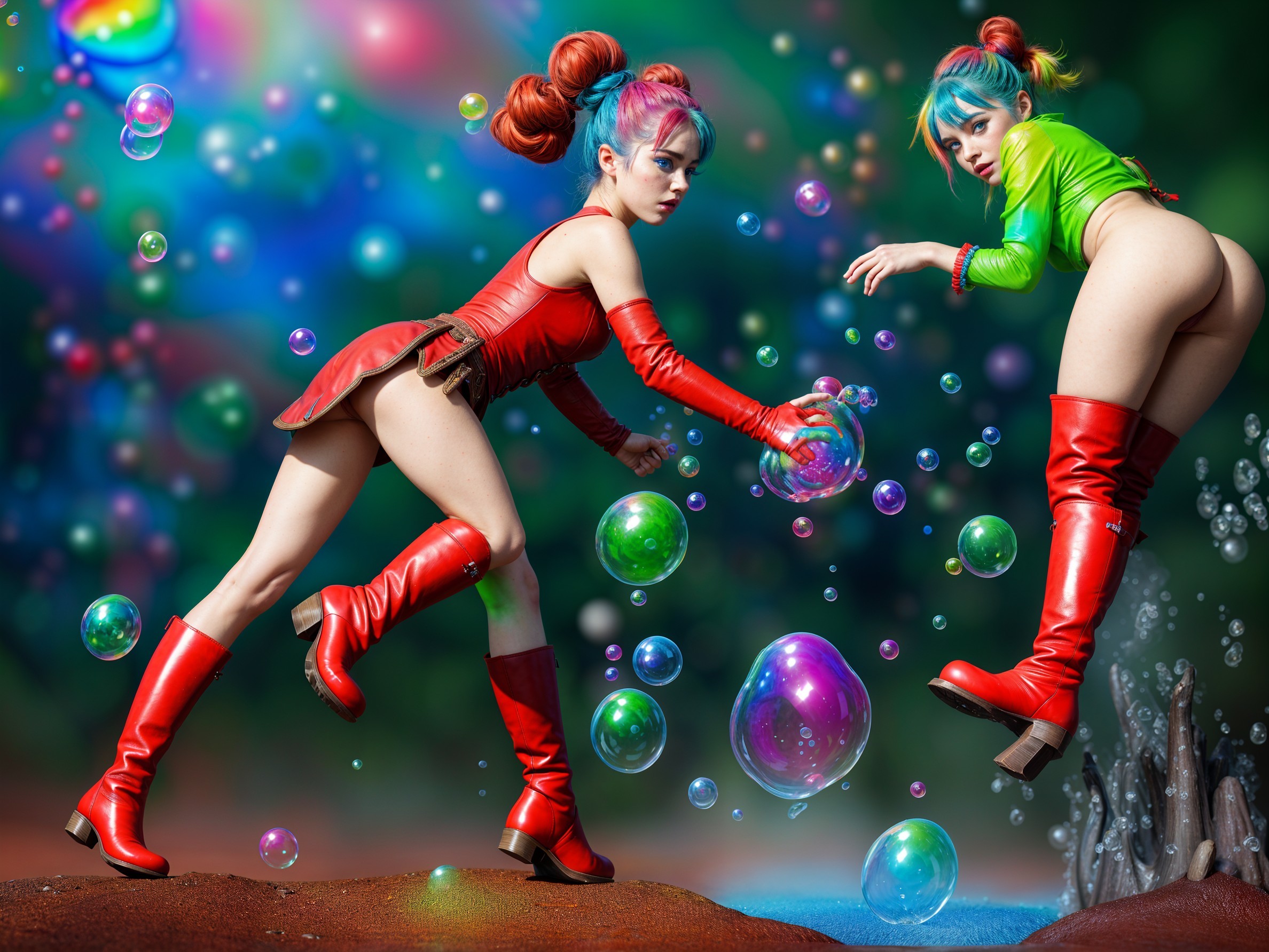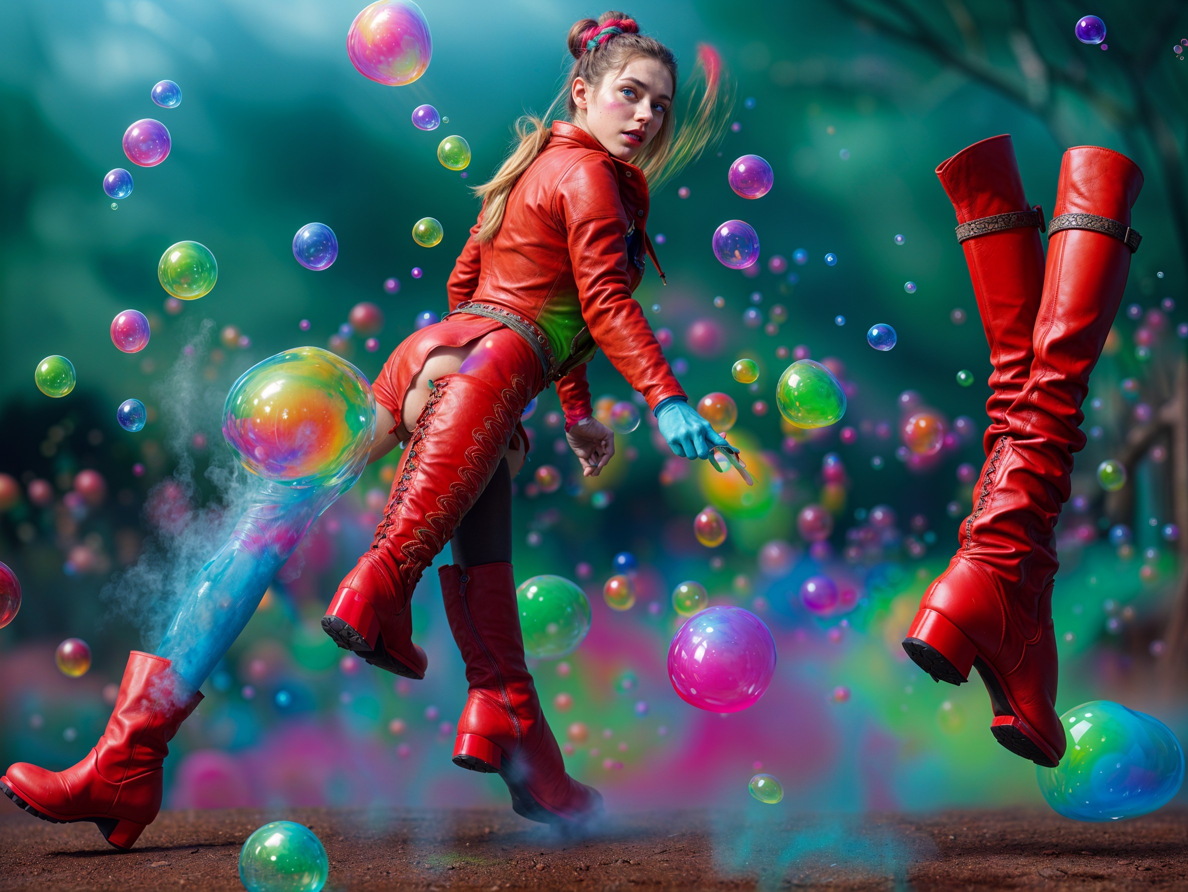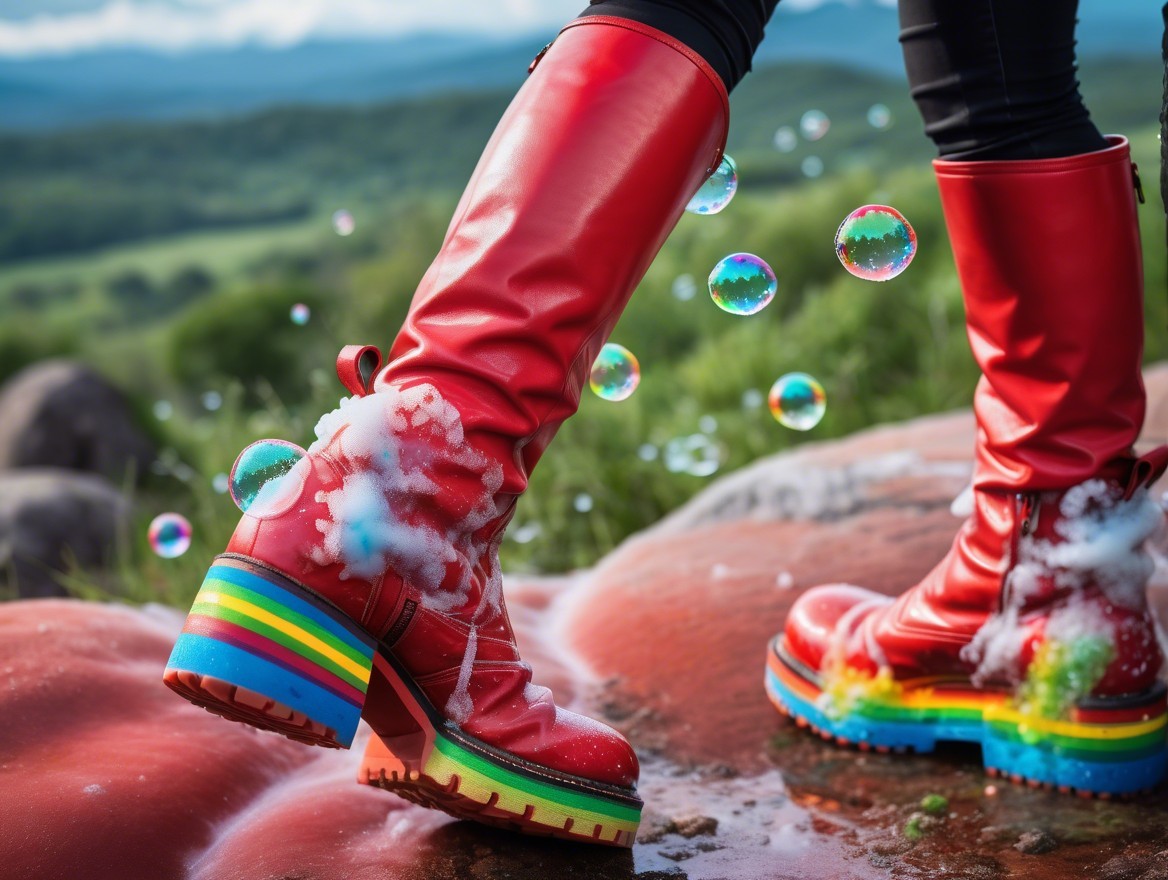 A whimsical scene featuring bright red boots and green socks, playfully immersed in bubbles against a colorful, smoky background with floating orbs, creating a vibrant, fun atmosphere.