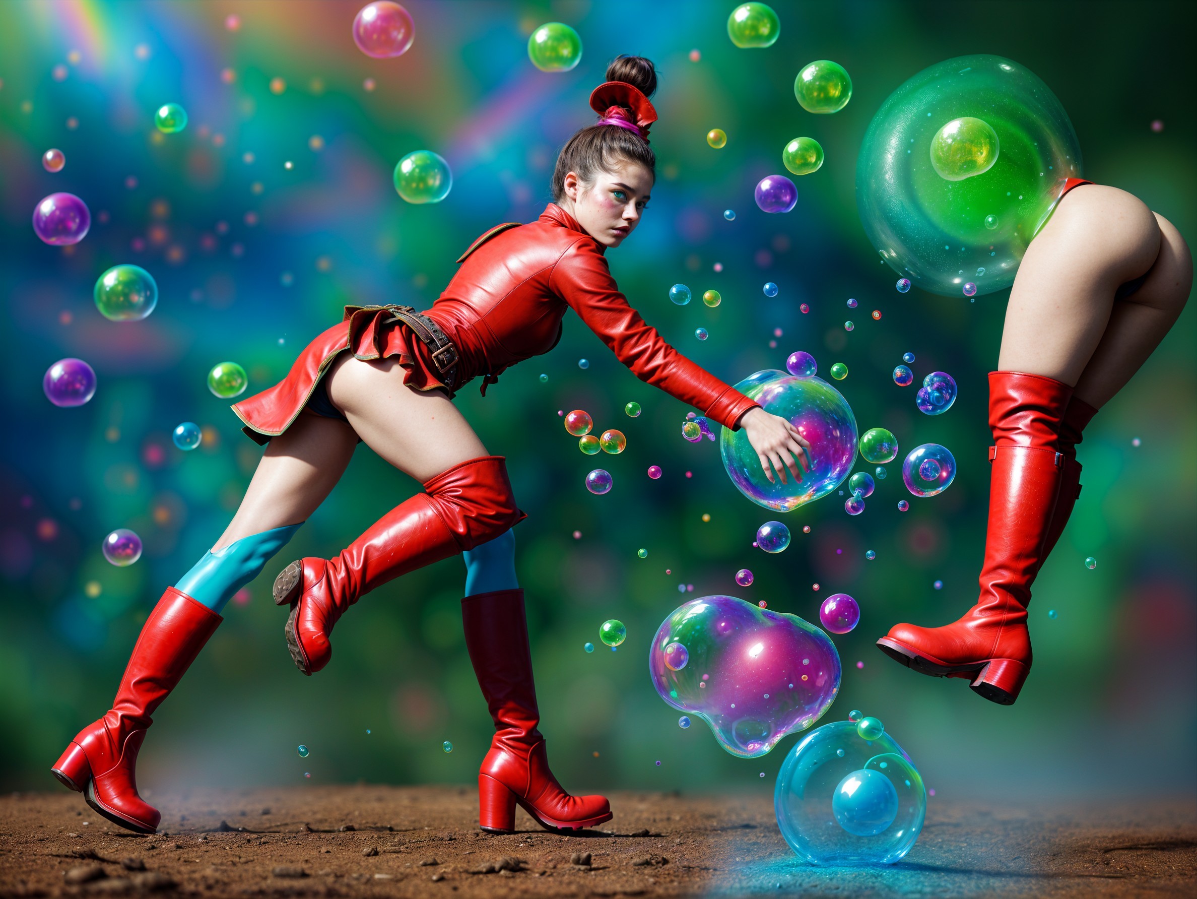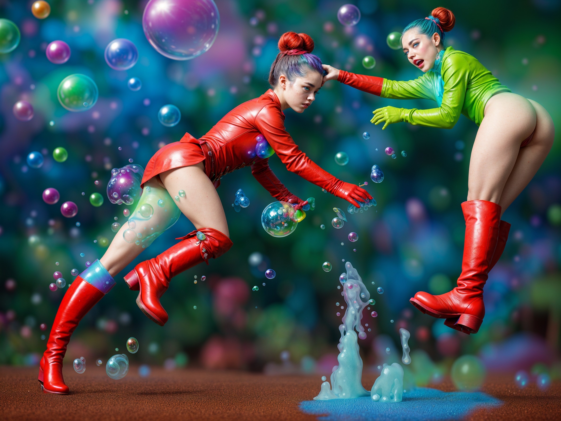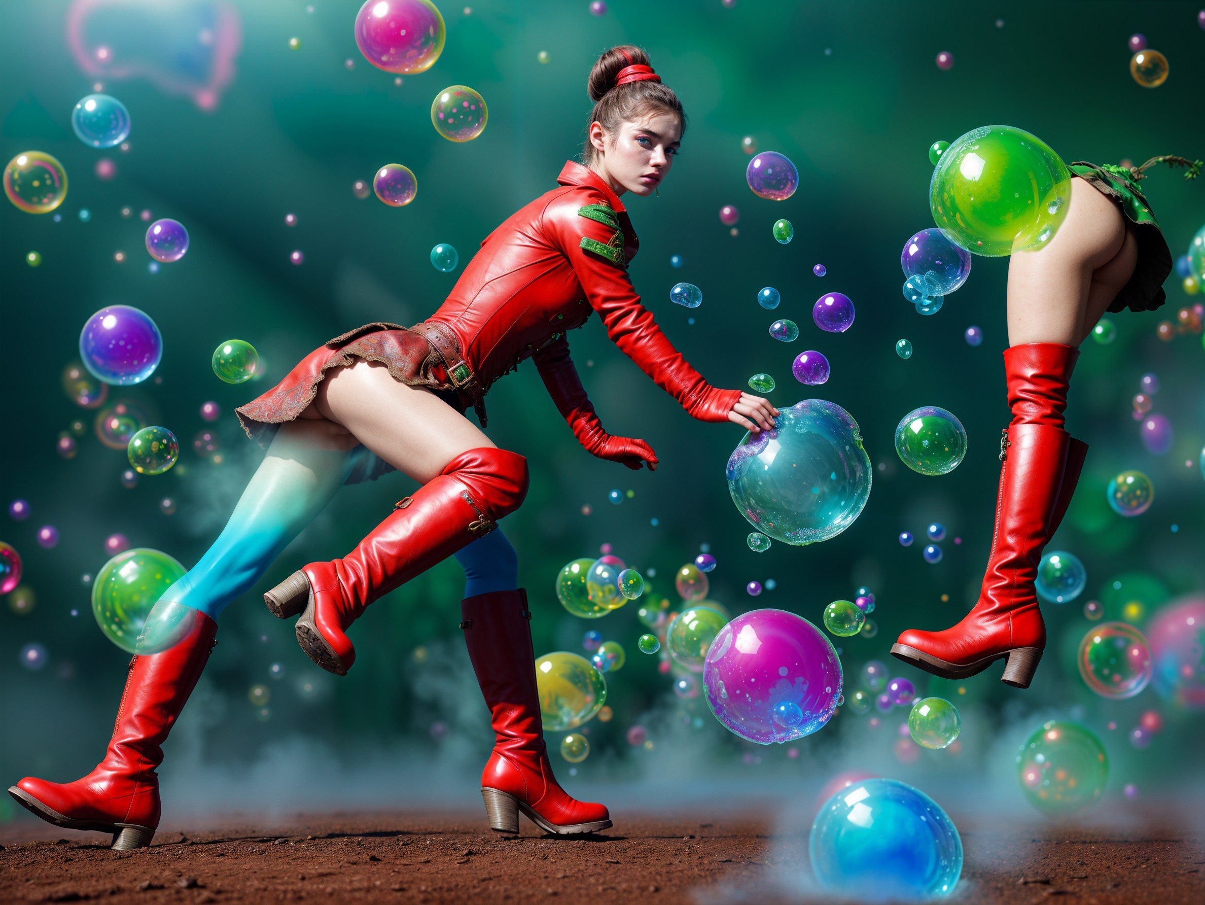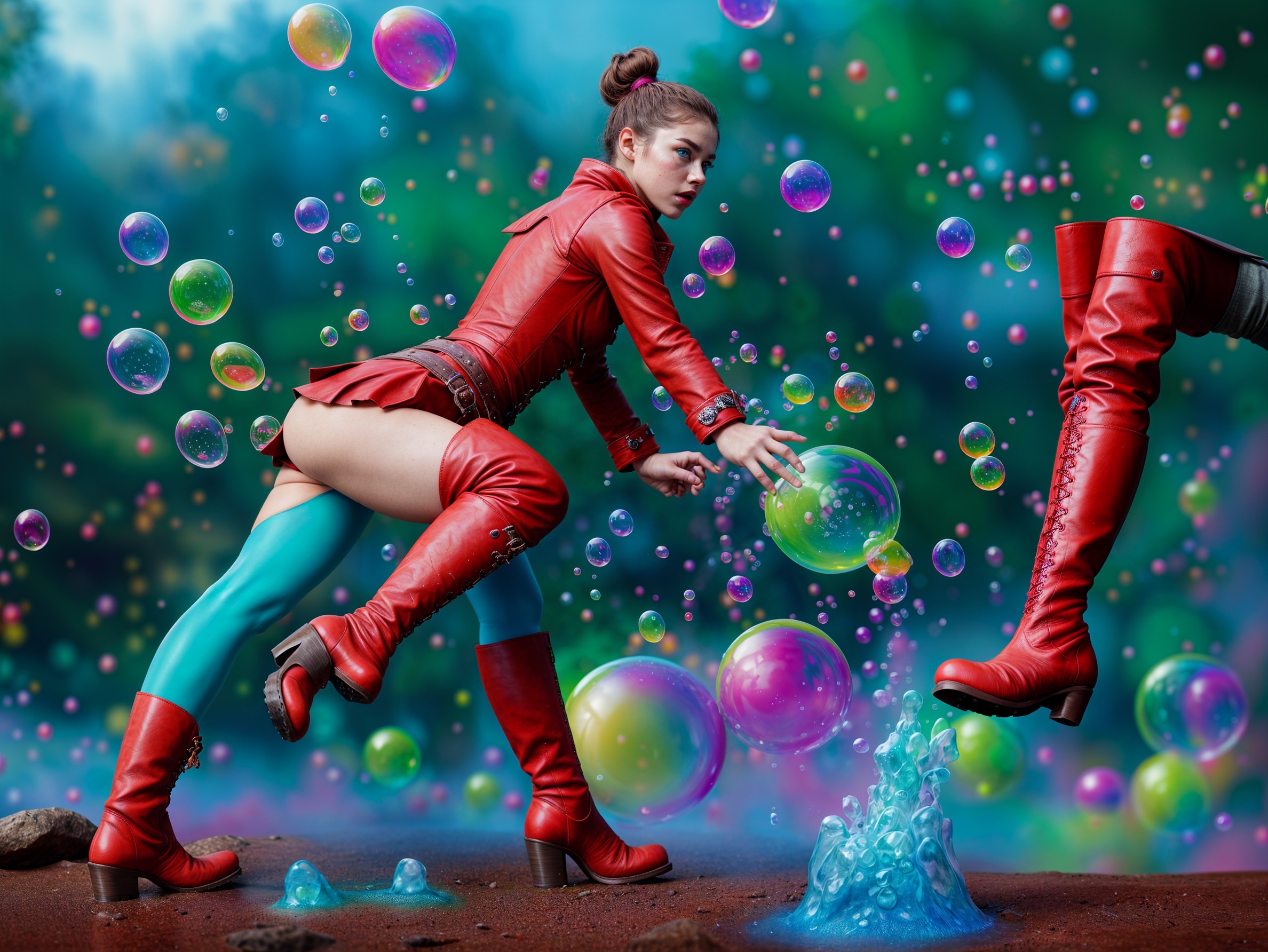 A whimsical scene featuring bright red boots and green socks, playfully immersed in bubbles against a colorful, smoky background with floating orbs, creating a vibrant, fun atmosphere.