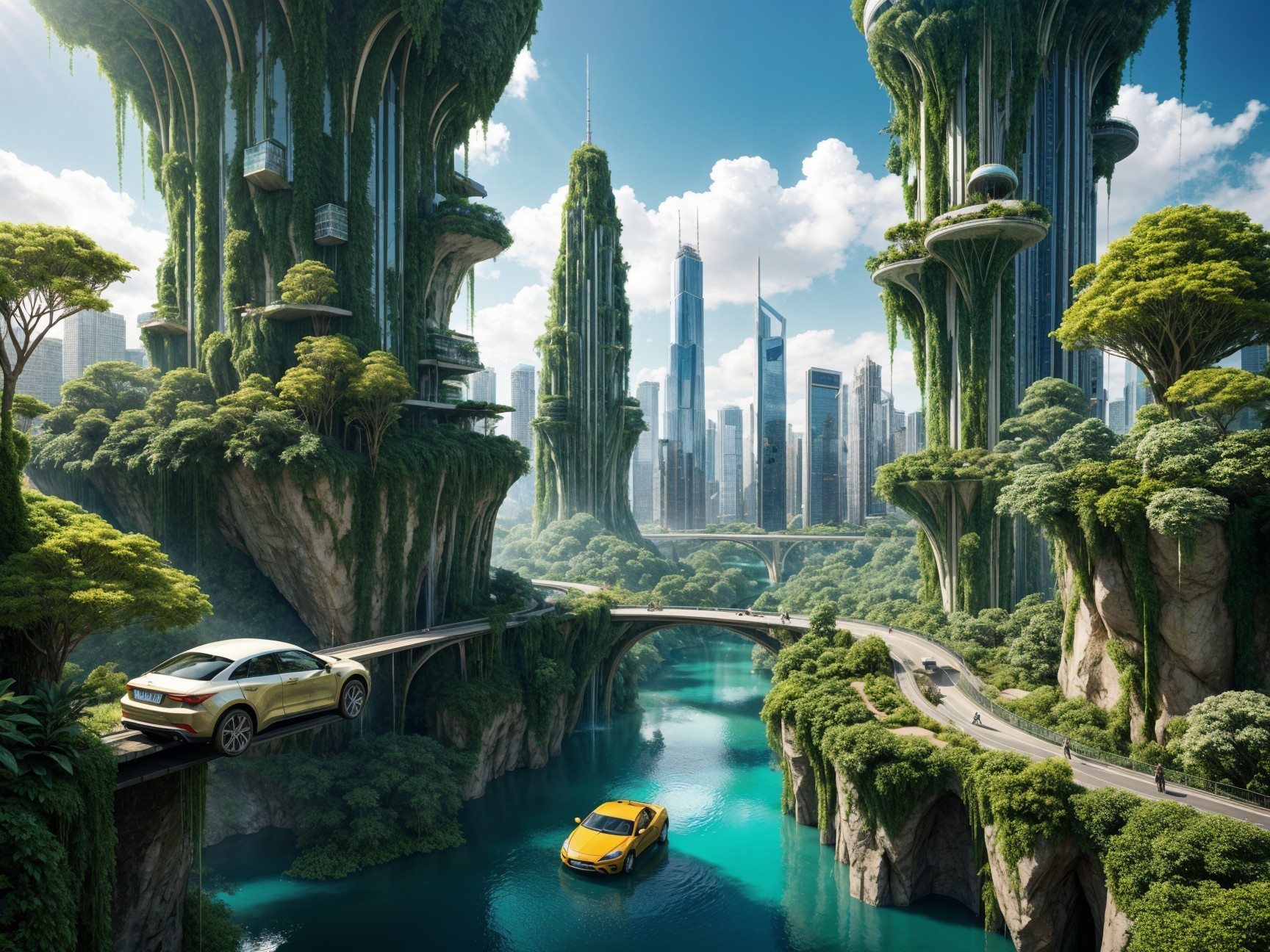 A surreal landscape featuring a luxurious car and a yacht on a scenic bridge. Towering futuristic skyscrapers rise in the background, surrounded by lush greenery and a serene body of water.