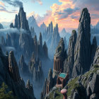 A striking landscape features jagged mountains rising dramatically, with a helicopter flying overhead. At the base, a unique wooden house with a blue roof stands amidst the rocky terrain.