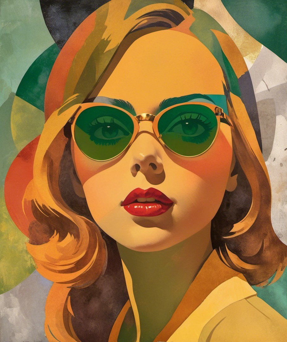 Portrait of a young woman in stylization of Lee krasner. Gouache paint merged with watercolor, pulp art,by Earl Moran, stan lee and Haddon Sundblom, hues by Georgia o'keffee and Overton Loyd and Bob Larkin, 1940s space age style collage, american gothic 1.3, otherworldly, dynamic lighting from bottom, sculpted, retrofuturistic details, baroque, colored by john buscema, Large sunglasses. Fine strokes in green. Expressionism. Orange forehead. Bright fancy hair. Parallaxocclusion1.2, octanerender, traumacore, heartpunk, foampunk, sweaty, crisp quality, anatomically correct, visionary depth, vaporous blurry aura, fantasy movie still, synthetic, serene, somber, desaturated colors in hues, cottagegore 1.2, dyed, expired film, xeroxed with Ilford Sprite 35-ii Reusable camera, push processing technique, dreamscape,