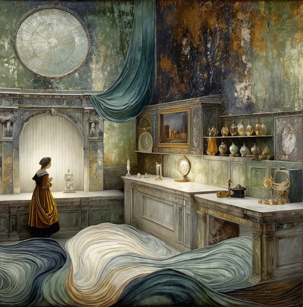 , nostalgia, glory,. Mercury Glass patina, light and gossamer haze, topographic lines, Art Brut, moody, somber, desaturated colors. In the style of John Rogers cox . This artwork amalgamates the artistic styles of Michael Parkes,