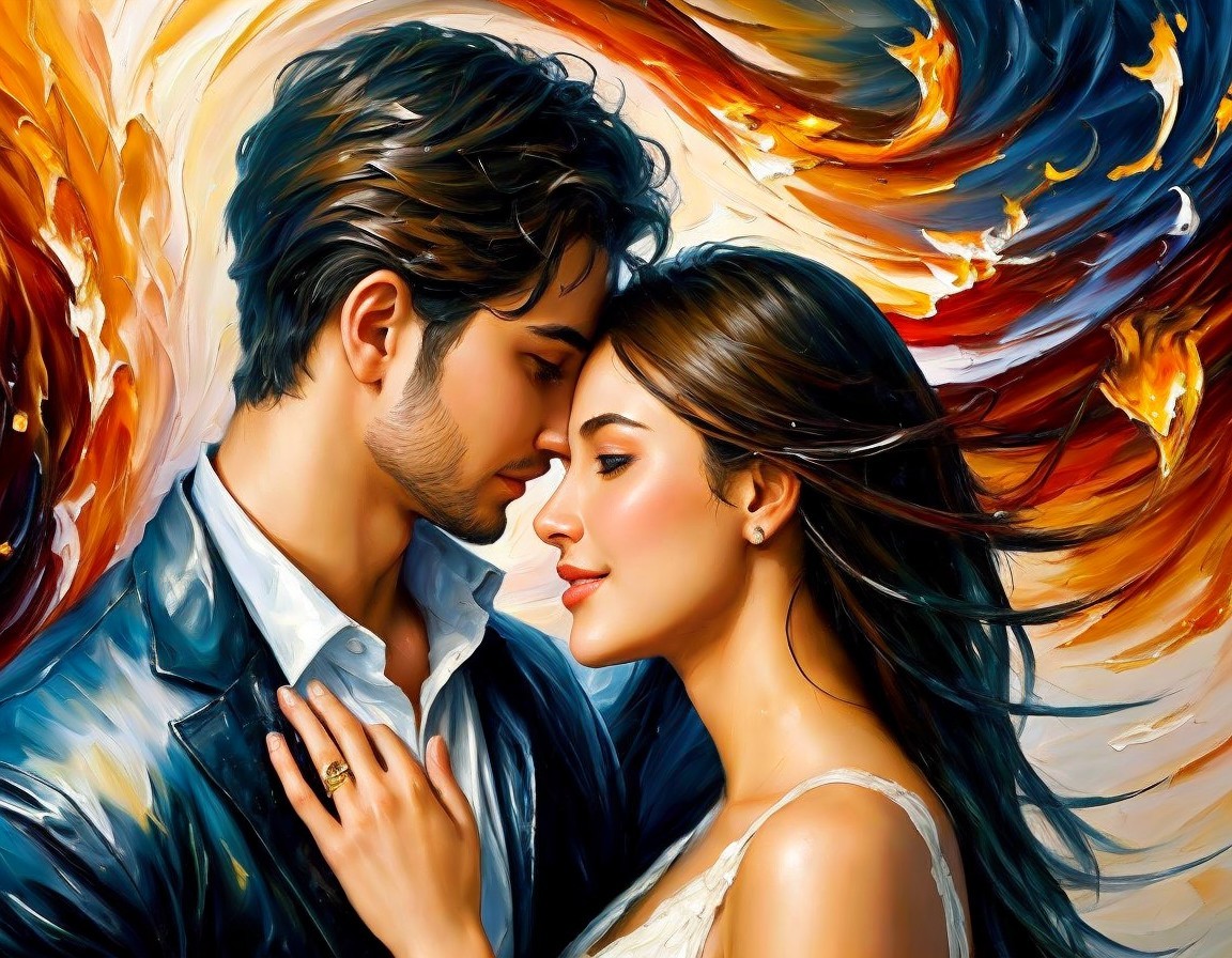 A vibrant painting of a couple embracing, their profiles touching, amidst swirling, fiery colors suggesting passion and intimacy.