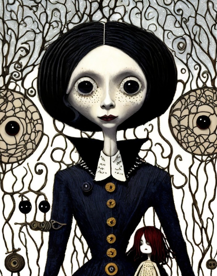 Pale wide-eyed female character in navy dress with eerie tree and doll-like figures.