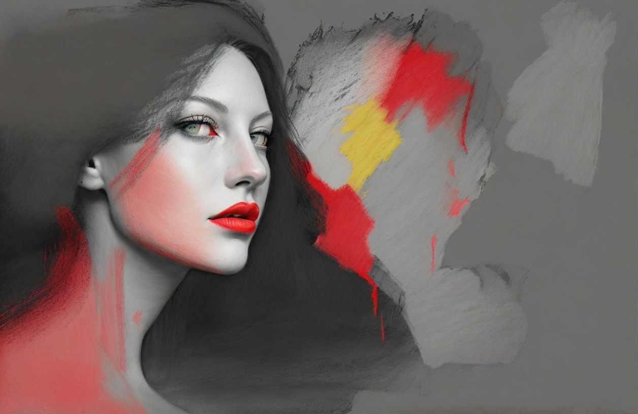 A striking portrait of a woman with bold red lips, set against a gray background. Abstract geometric shapes in orange and yellow accentuate her profile, blending realism and modern art.