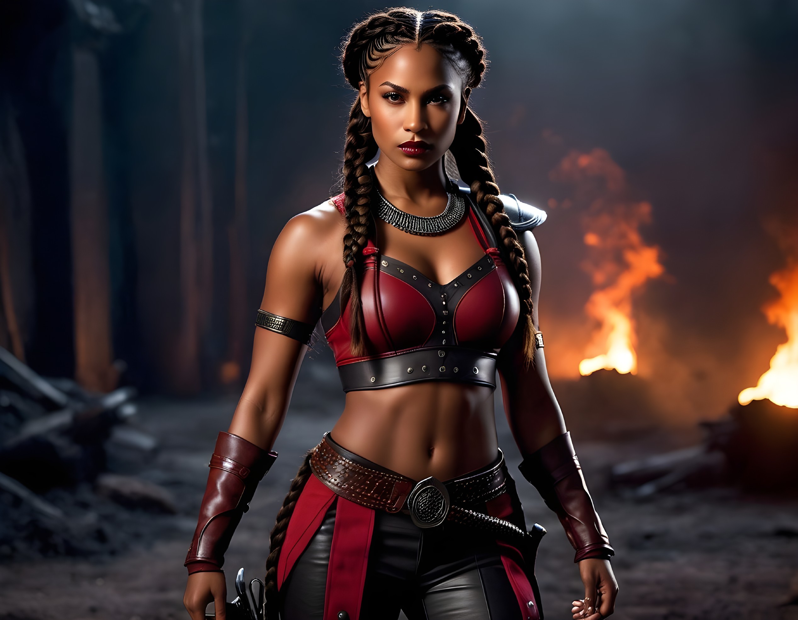 A strong warrior stands confidently in a dimly lit setting, adorned in striking red and black armor, with braided hair and an assertive expression, ready for battle amidst smoky flames.