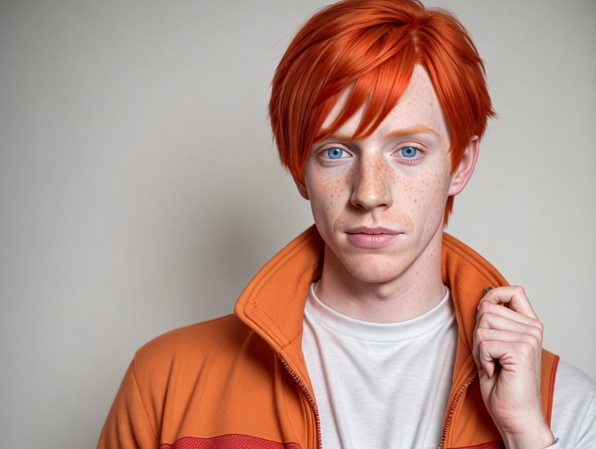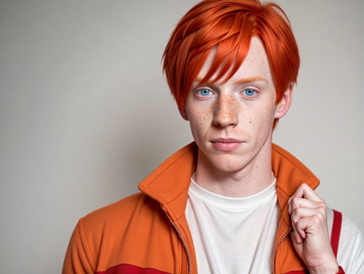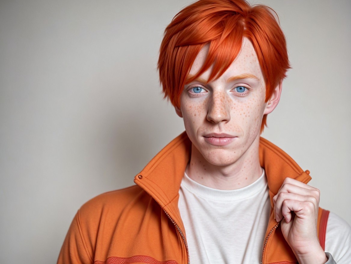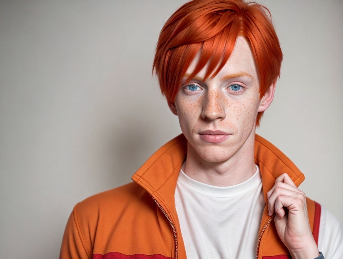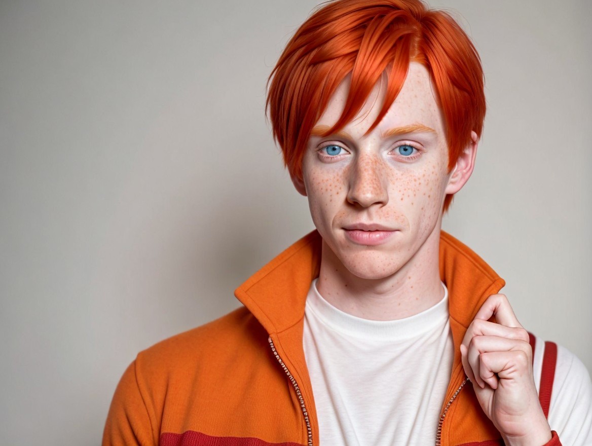 Prompt: "Ronald Weasley ( fiery red hair and a freckled complexion. He had blue eyes, a long nose, and was described as being very tall and lanky, with big hands and feet),"