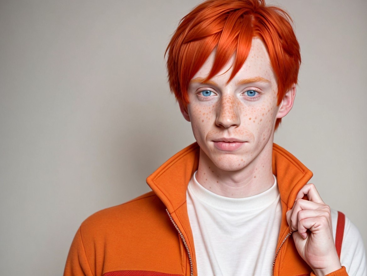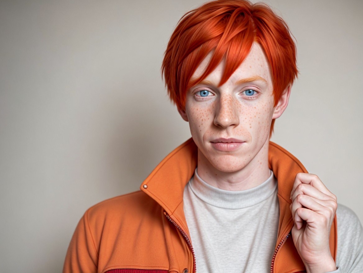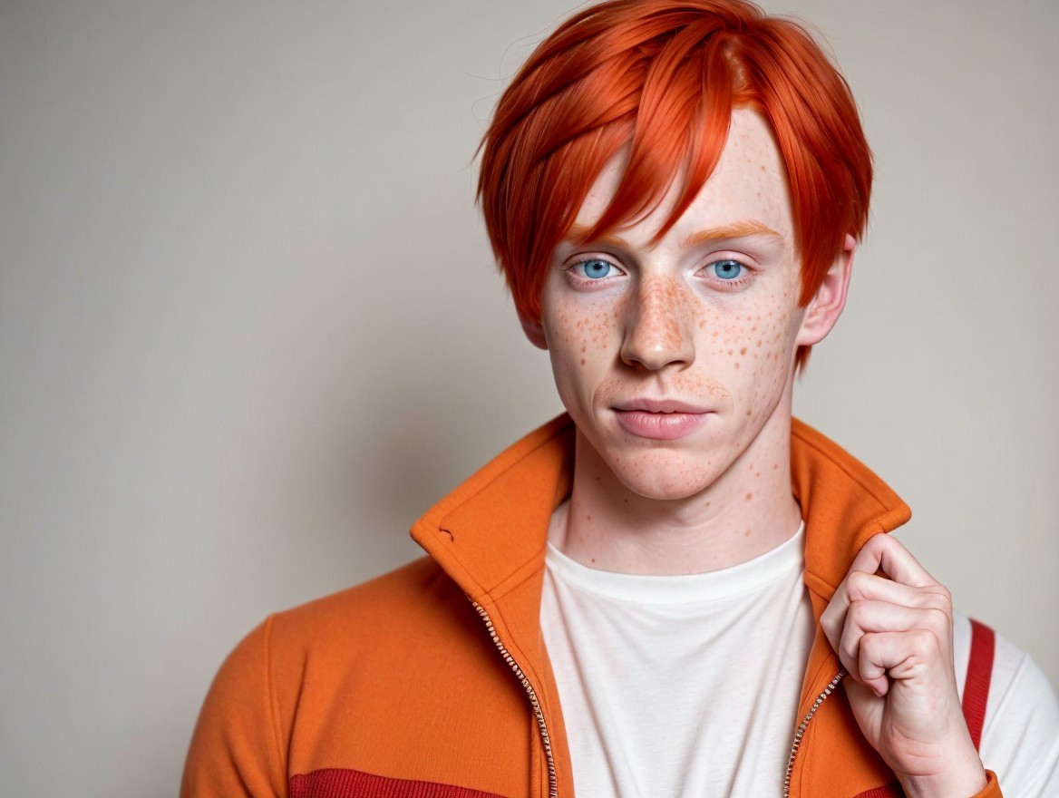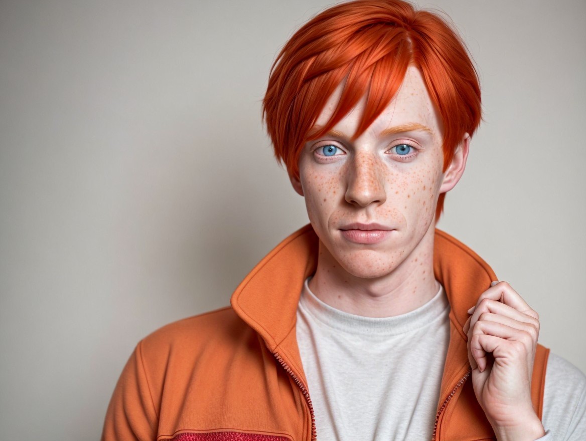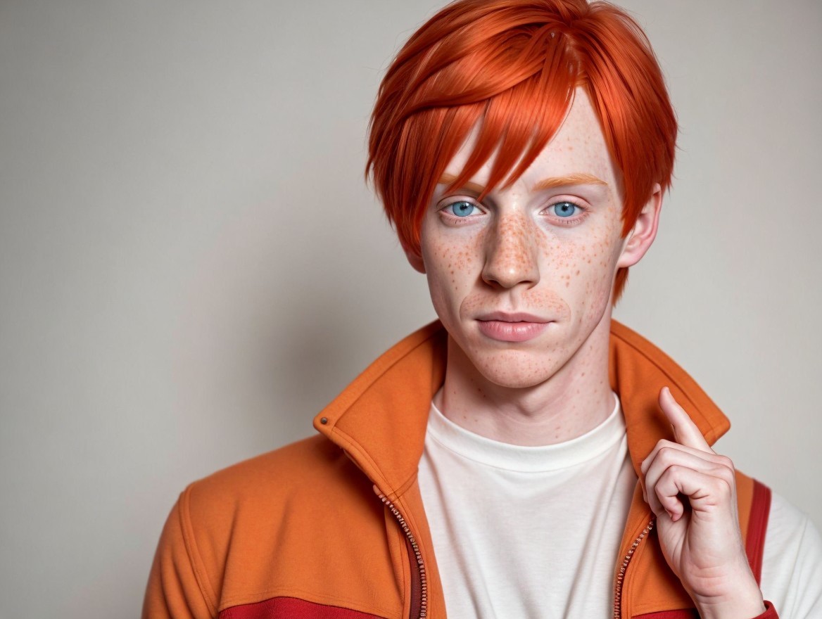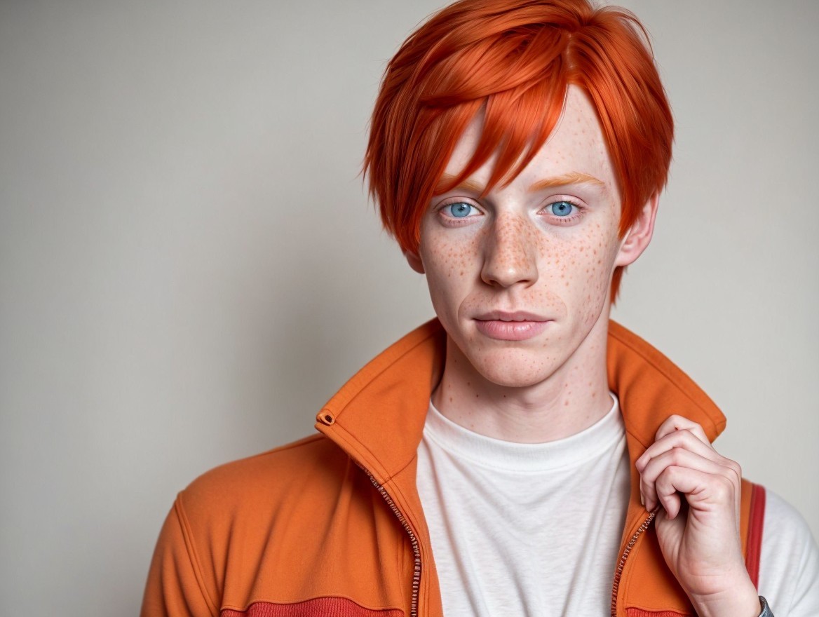 Prompt: "Ronald Weasley ( fiery red hair and a freckled complexion. He had blue eyes, a long nose, and was described as being very tall and lanky, with big hands and feet),"