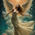 The image features ethereal figures with intricate hairstyles, adorned with golden elements against a green backdrop. Their serene expressions convey a sense of mystical beauty and connection.