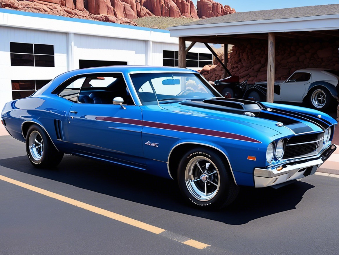 A sleek, black vintage sports car with neon green accents sits on a desert road at dusk, framed by stunning rock formations and a colorful twilight sky.