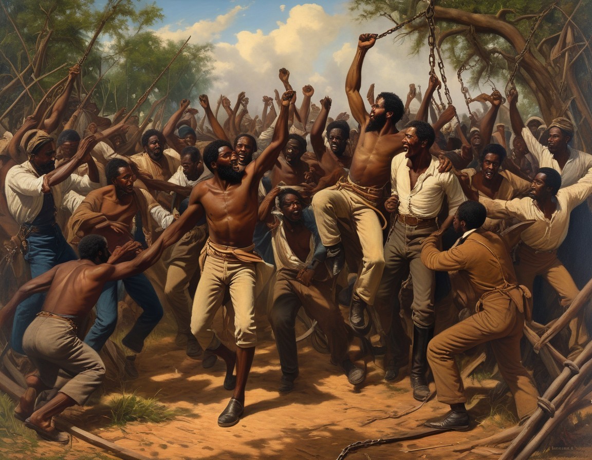 A group of African American men celebrating and breaking chains, symbolizing emancipation and freedom on June 19th, 1985.