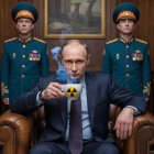 A confident man in formal attire sits in a leather chair, holding a steaming cup with a radiation symbol. Two uniformed military officers stand behind him in a lavish office setting.