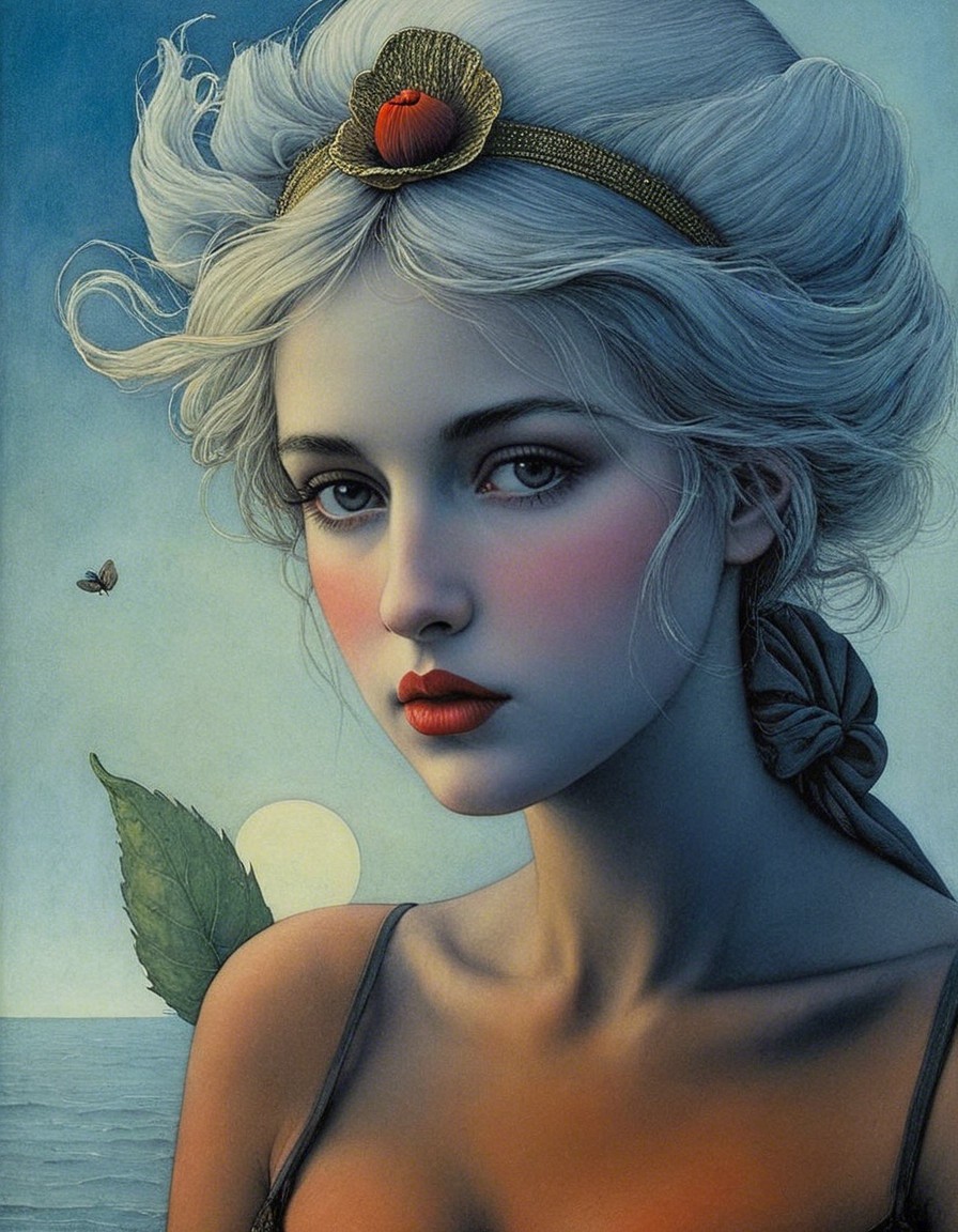 A serene woman with flowing silver hair adorned with a flower gazes intently. In the background, a distant castle rises against a tranquil sea, with birds soaring in the sky.