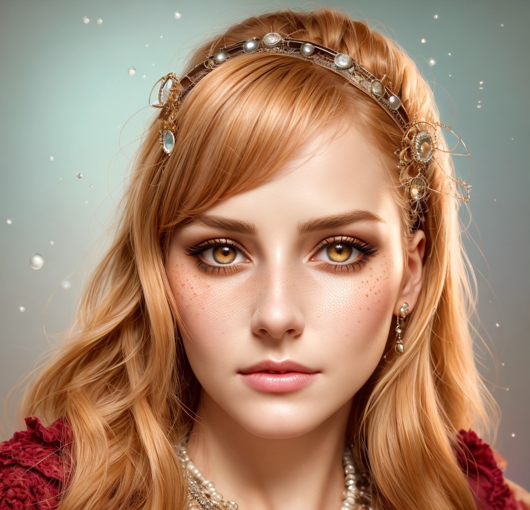Headshot portraiture, styllized beautiful female enchantress in edwardian blouse with crackles, crochets, contraptions, detailed nose, realistic devilish eyes, dynamic lighting 1.8, High coloring, detailed close-up portrait, stylized face, watery alcoholic painture and ink, dots and flares and splashes, soft edges, back-lit, triadic color scheme orange beige red, rim lighting, brushed paint, gothic futurism, chiaroscuro lighting, ambient occlusion 1.5, shadow mapping 1.3, 3d effects 1.8, intricate stylized hairstyle, brightness 1.7, stylized zentangle lines, abstract, coherent, retropunk, sweaty, creamy occult, Anglocore 1.9, auracore, high coloring 1.9, atompunk 1.9, cottagegore 1.9, retrofuturistic details of ornate, silver particles, dreamy glow, tints of abstract art nouveau illustration,  Pop Surrealism, illustration on old paper, tints of timlin, 3d effects 1.9, dynamic lighting 1.7, ambient occlusion 1.5, anisotropic filtering 1.9, raytraced shadows, ethereal, otherworldly, abstract style 1.7, hues, grain, blurry aura, fantasy movie still, synthetic essence, raytraced shadows, dark fantasy art, brightness 1.7, octane render illustration 1.5