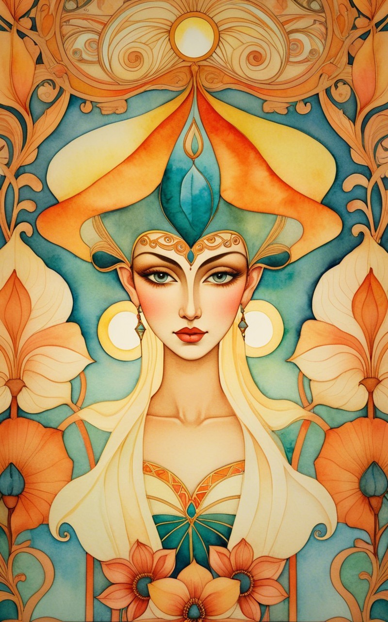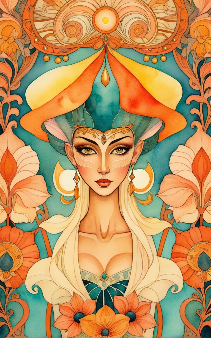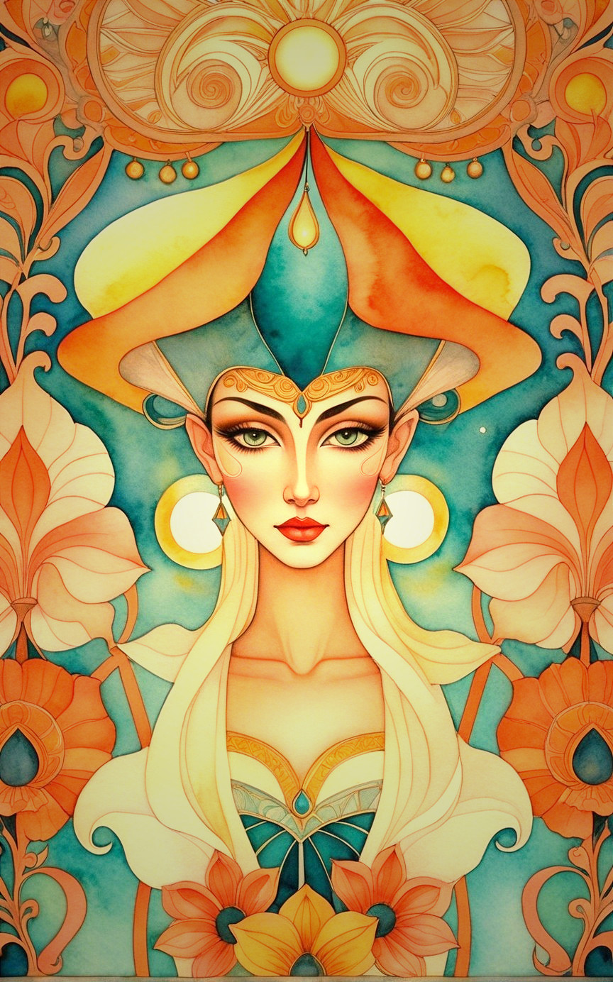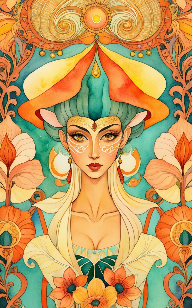 Ancestral enchantress, occult theme, mysterious juvenile, watercolor and ink style, floral motifs by Ho Baron, south-american folk-art, asymmetrical blossoms, filigreed, leaves and catenaries, botanical inspired linework, art nouveau inspiration, William Turner lighting, geometrical, symmetrical, slightly dystopian ambiance, extremely detailed, stylized face, fantastical, flamboyant coloring, light-orange, dark-yellow, teal, sea-green, light-green, brightened, liminal, empathic, flourescent, quivering, quilling, wavery coloring in thick bold lines, cel-shaded style, Henri de Toulouse-Lautrec influence, Bloom-Effect, subsurface scattering, textured layers, painterly elements, glossy finish, HDR, blurred color schemes, watercolor effect, Raytraced shadows, divisionism techniques, luminism, sfumato-effect, dreamcatching, tall and lean details, quilling, watery thinned colors, pale-green, cerulean, sea-green, beige, yellow, watercolor details, paint splatter, worn and rough surface, stippled, blotted, tesselated, debeh, bokeh, Haddon Sundblom hues, acrylic art techniques, oxidian hues, golden shadows, retro flair, surrealistic vibe, contouring outlines by Ho Baron, vertical layout, emulsion lifts, whimsical gothic elements, ancient blurred background, angled, squiggly surreal splash art, 3 point lighting, glowing bioluminescent aura, liminal atmosphere, traumacore elements, overexposure. Suitability, appropriateness, accuracy, skills, hadow mapping, parallax occlusion techniques, luminous plasticity.