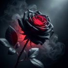 A stunning close-up of a vibrant red rose, glistening with dewdrops. The petals are richly layered, contrasting against a dark, smoky background that enhances its beauty and elegance.