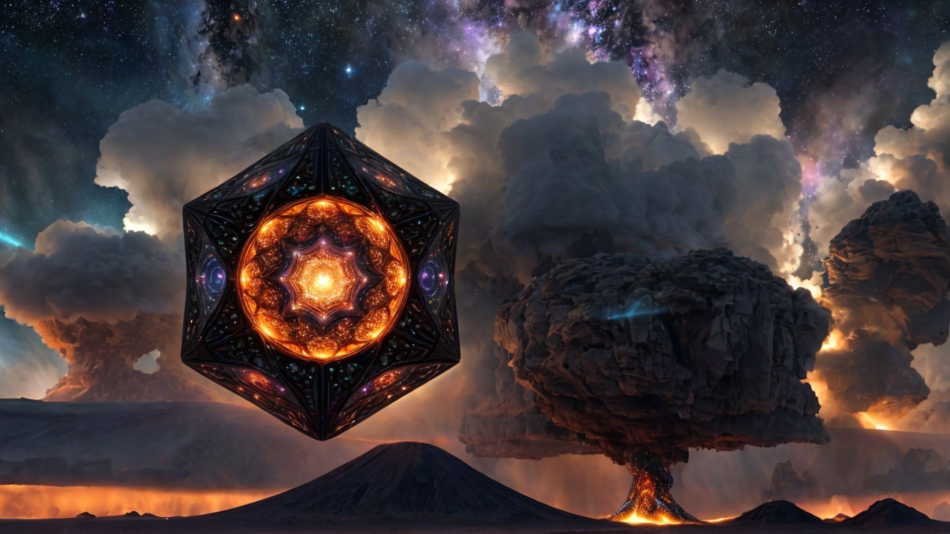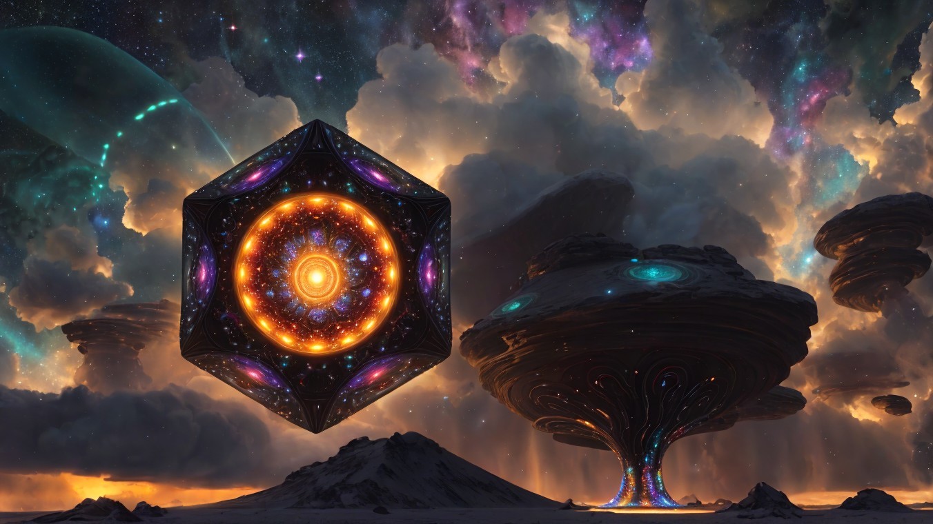 A surreal landscape featuring a colorful nebula, with a glowing cosmic cube and a disk-shaped portal hovering over an alien terrain.
