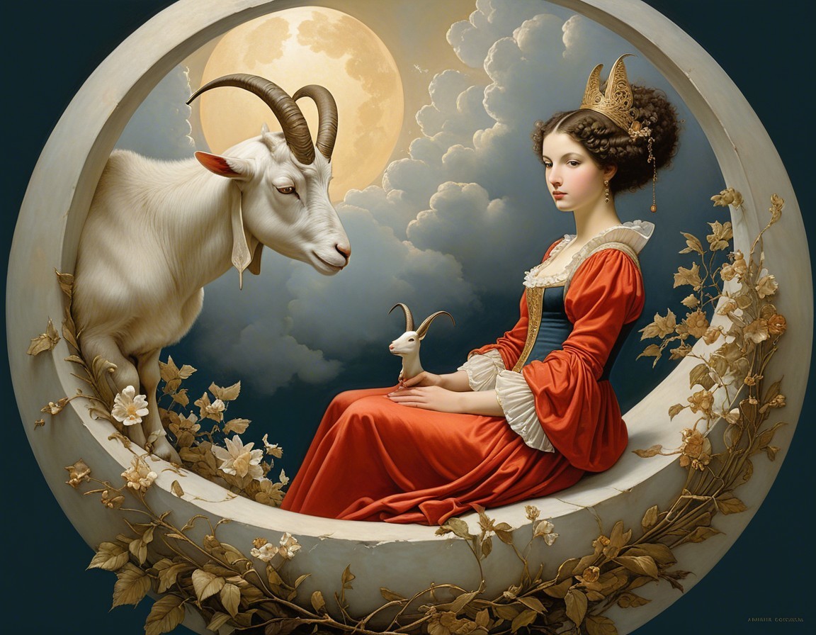A serene scene featuring a young woman in an orange gown seated beside a majestic goat, under a luminous moon. Soft clouds and white flowers enhance the ethereal atmosphere.