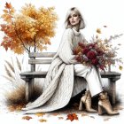 A cheerful woman in a stylish gray coat sits among vibrant autumn leaves, with a city skyline in the background. Her smile radiates warmth amidst the fall scenery.