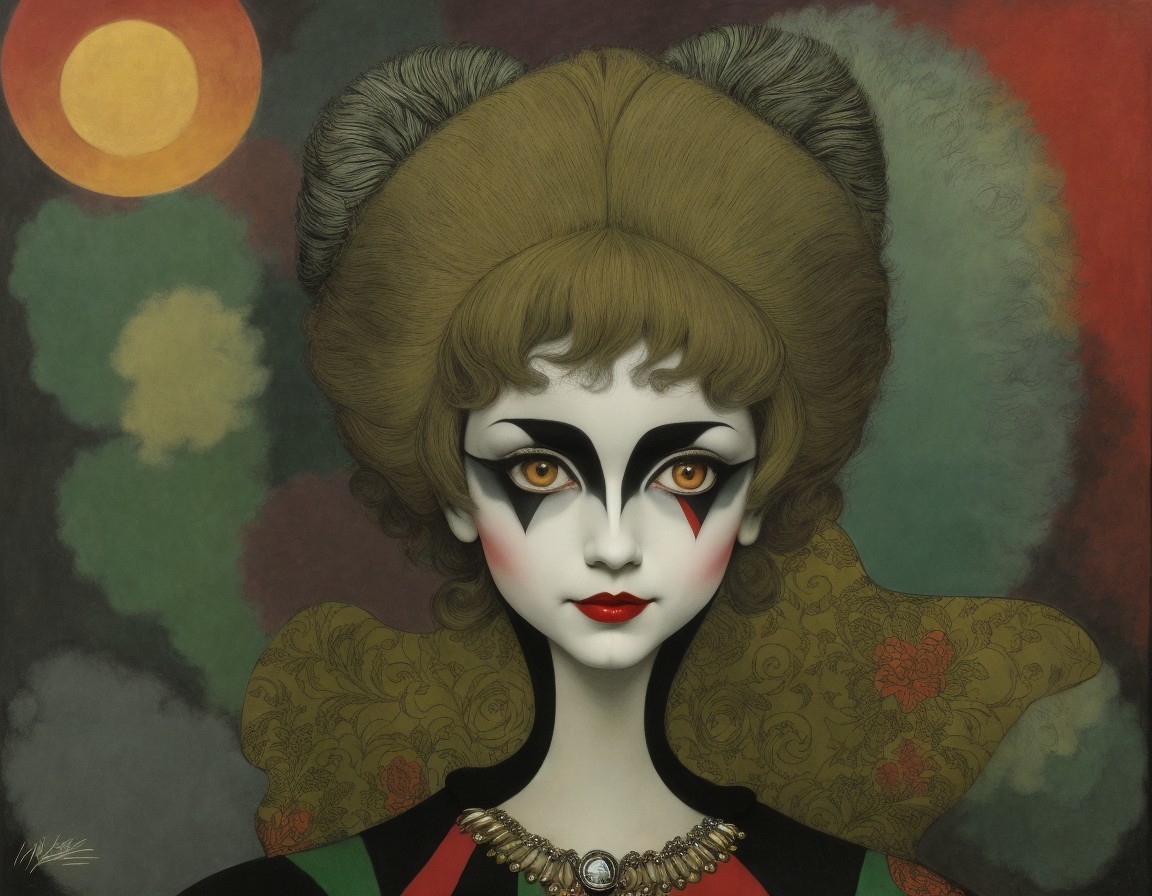Illustration of a clown with a ruffled collar, painted face, and vintage hairstyle, amid colorful balloons.