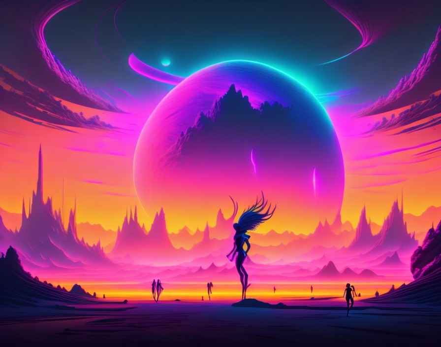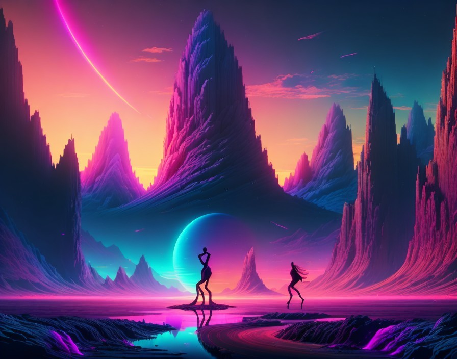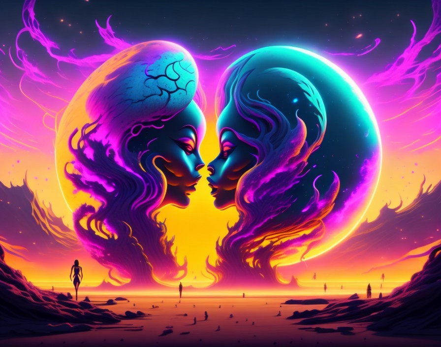 A vivid digital artwork depicting two stylized faces in profile, merging like a yin-yang symbol, set against a neon-lit, fantasy landscape.