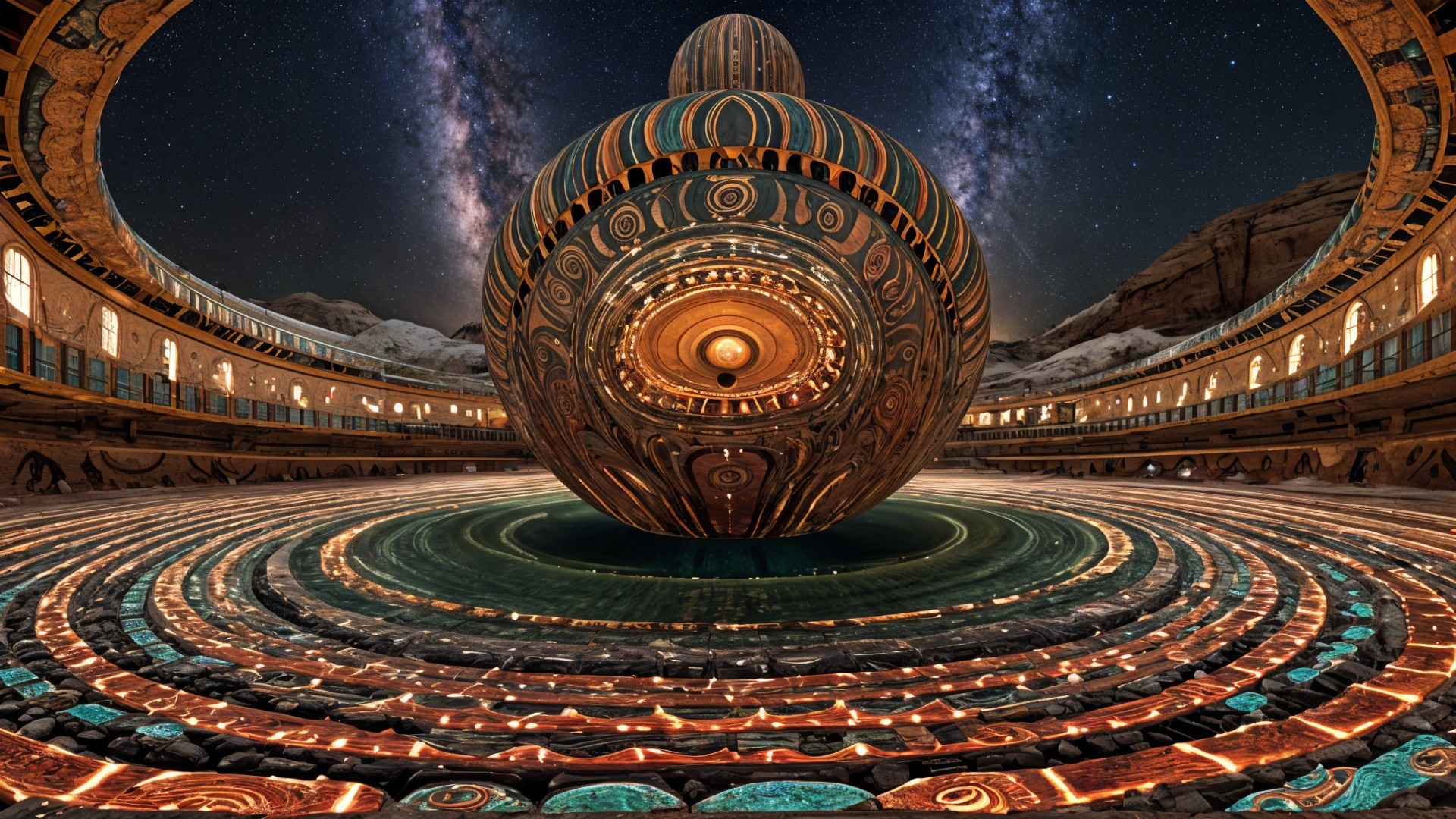 In a majestic, ancient environment illuminated by a starry sky, a large, intricately designed orb rests at the center, surrounded by towering stone structures and snow-capped mountains.