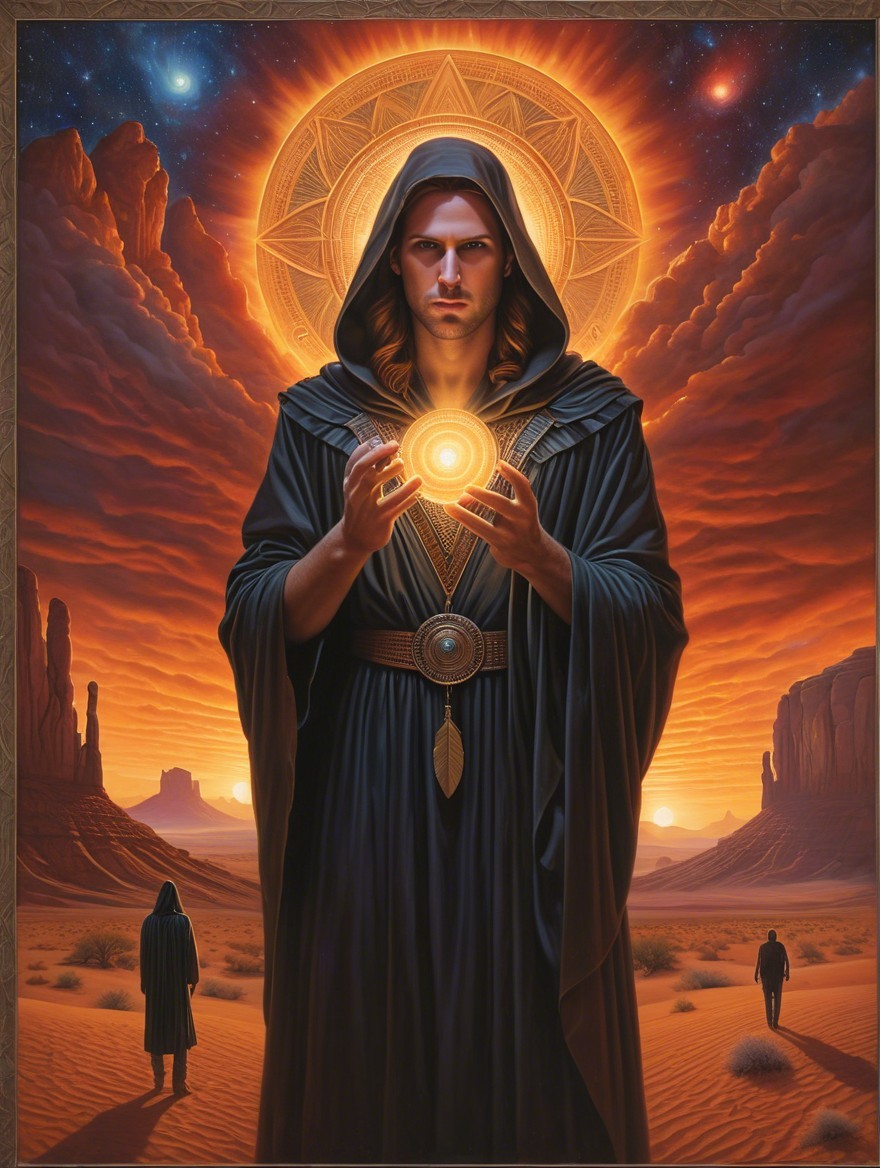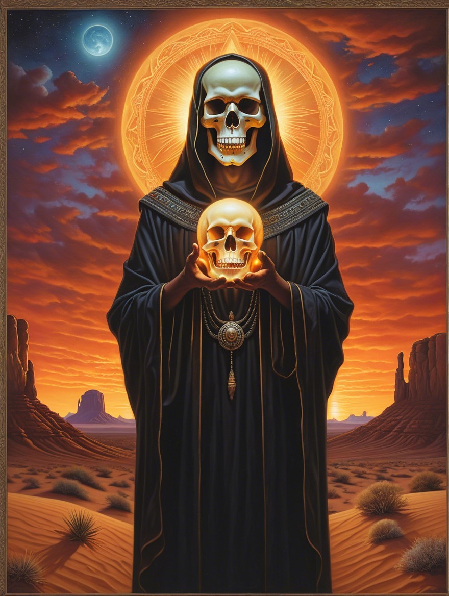 Cloaked Figure with Glowing Skull at Desert Sunset