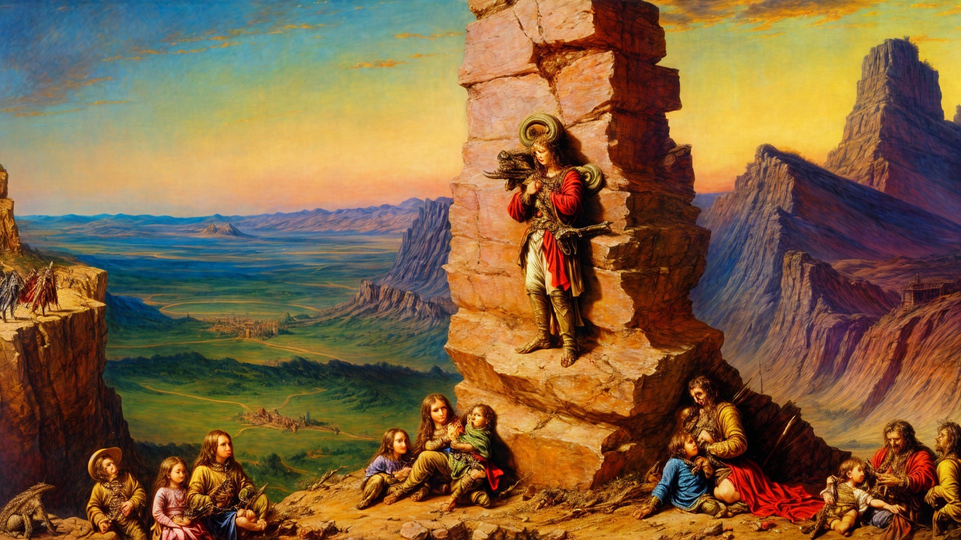 In a breathtaking landscape, a majestic creature stands atop a cliff, surrounded by figures in dark robes. The sky glows with sunset hues, creating an enchanting atmosphere.