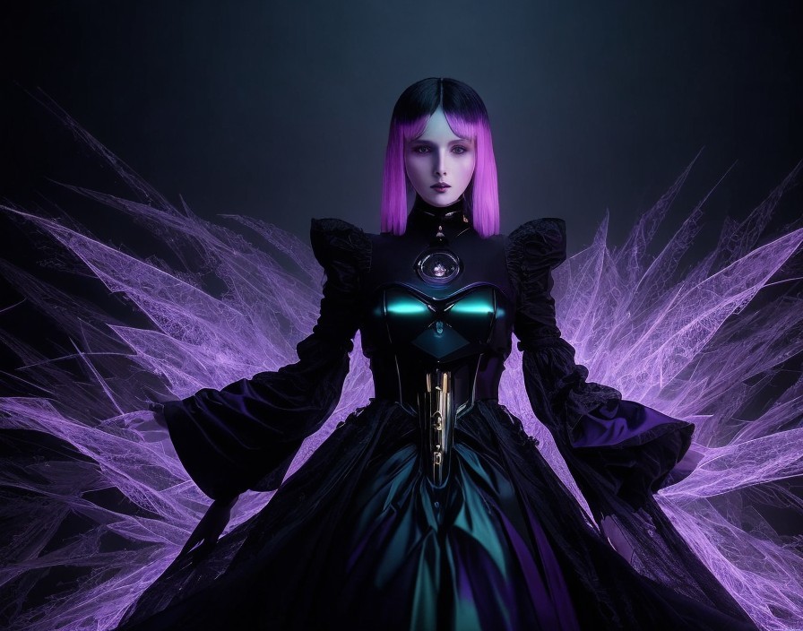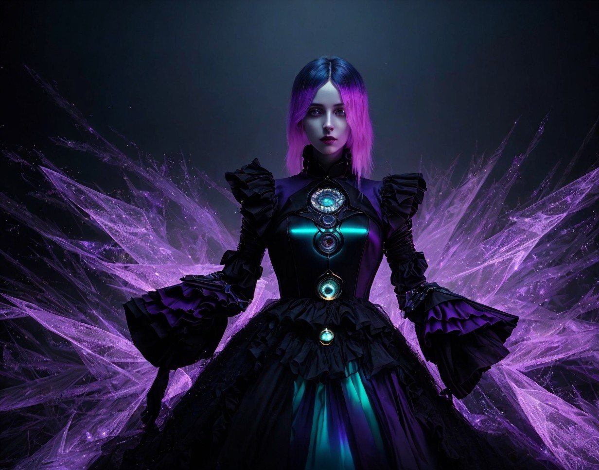 A woman with pink and blue hair in a gothic dress surrounded by dark violet crystalline structures.