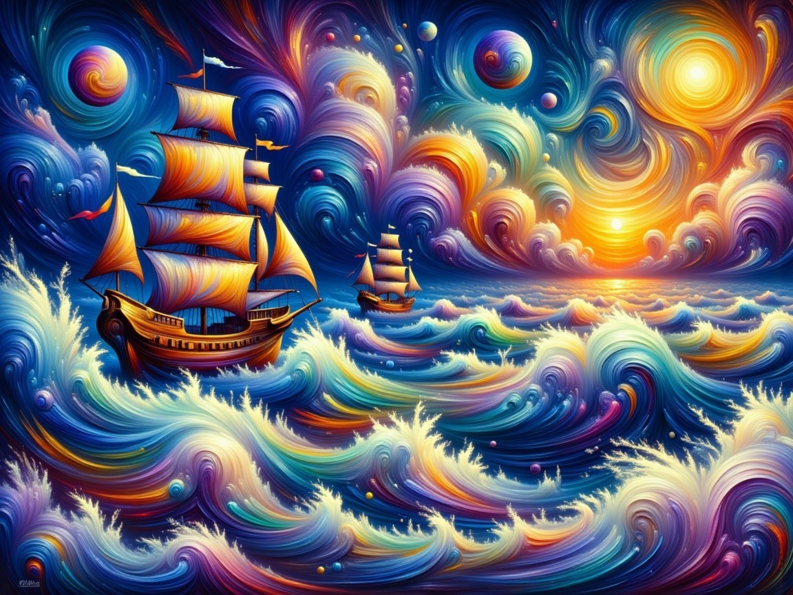 A vibrant painting depicts majestic ships navigating turbulent waves under a cosmic sky filled with planets and a swirling sun, blending sea and space in a dreamlike scene.