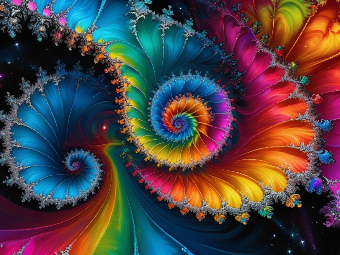 A vibrant, intricate fractal spiral in rainbow colors, twisting against a dark, cosmic background. The main spiral starts with a tight yellow, orange, and red center, expanding outwards through pinks, purples, blues, greens, and yellows. It is bordered by shimmering silver fractal details that resemble frost