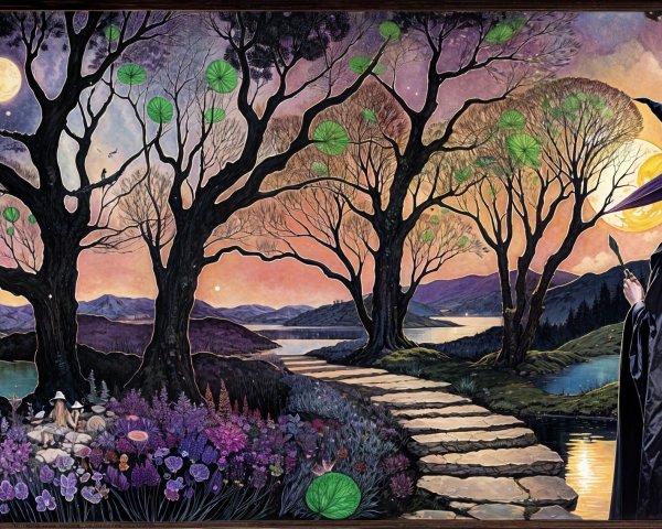 The artwork features a surreal landscape with two figures on a winding path, surrounded by stylized trees and moons. The color palette is dark and earthy, creating a mysterious, dreamlike atmosphere.