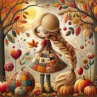 A whimsical autumn scene features a girl in a colorful, patchwork dress surrounded by vibrant fall leaves, pumpkins, and gentle forest creatures under a golden sunlit sky.