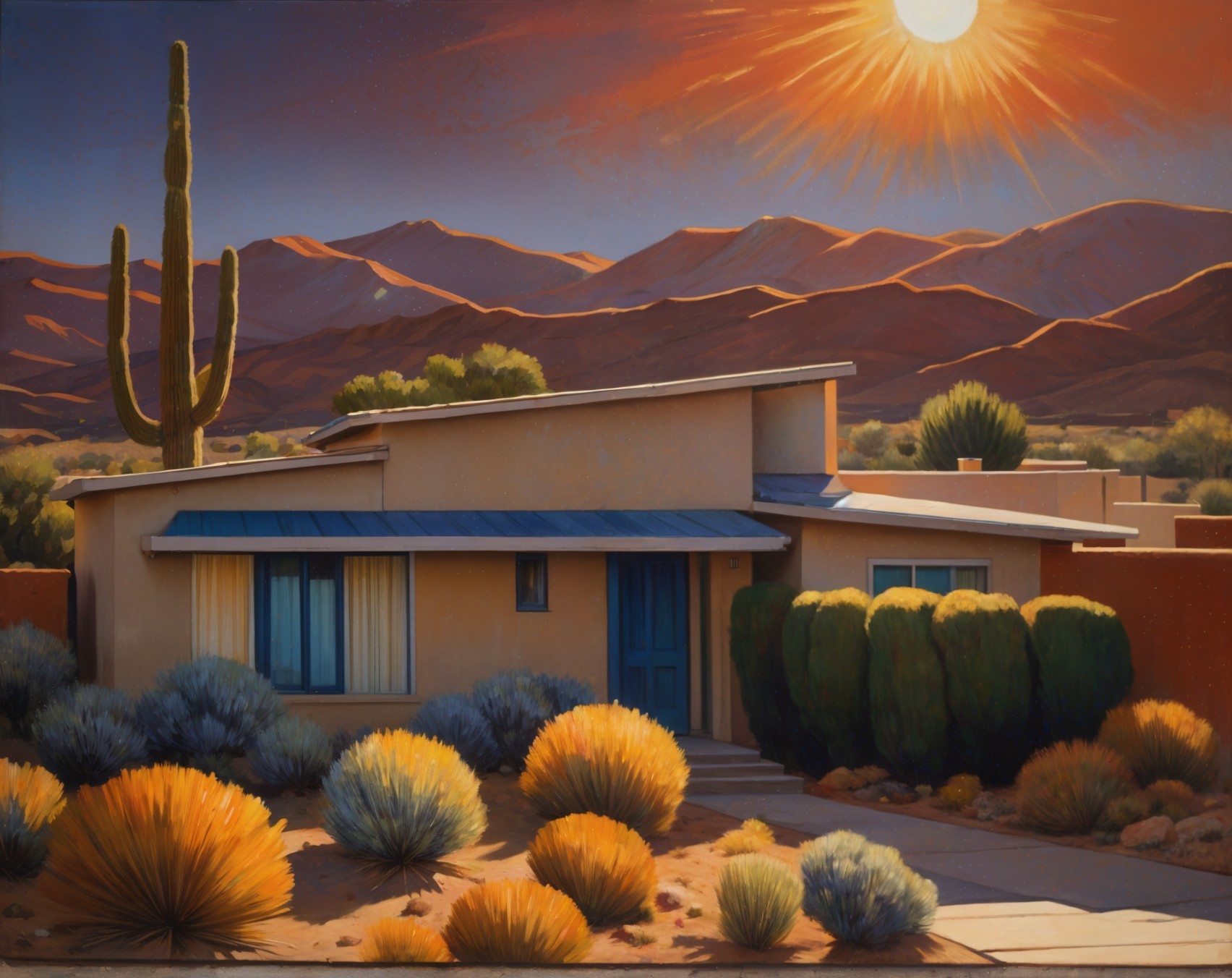 + Prompt:Vibrant rays from an early sunrise falls on midcentury desert suburbia. Rich and saturated hues of blue, orange and gold create an airy, serene atmosphere with colourful brushstrokes adding depth. Blue hour. Deep shadows, Lens flare, dry brushing, wet ink.