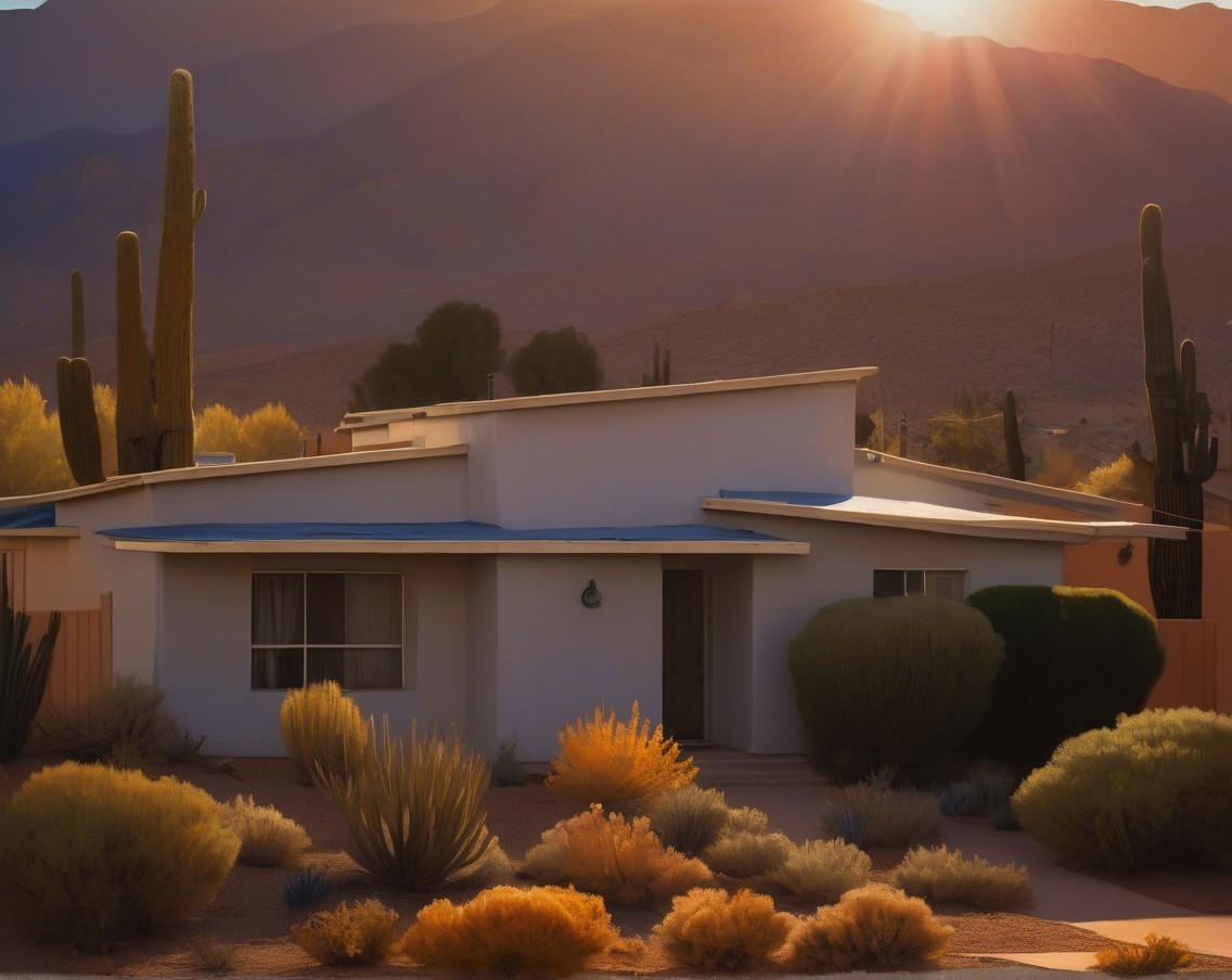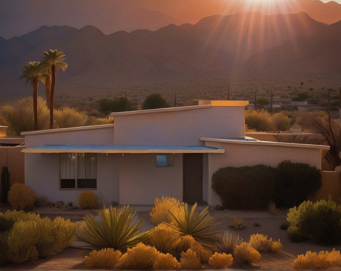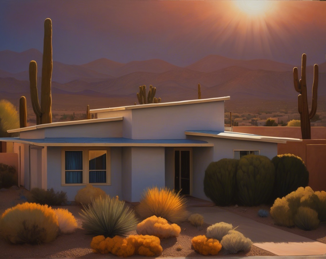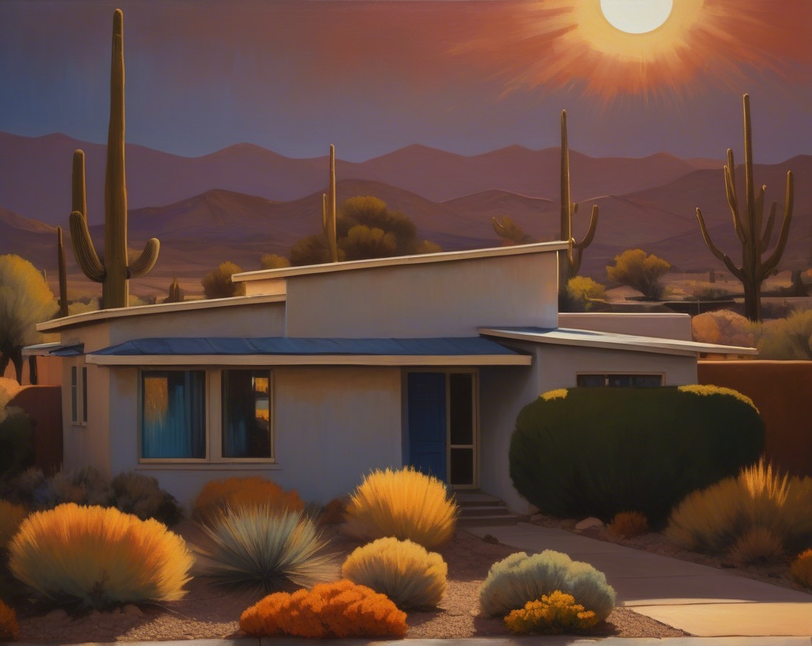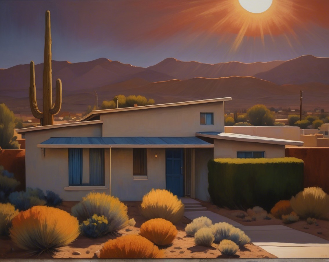 Prompt: Vibrant rays from an early sunrise falls on midcentury desert suburbia. Rich and saturated hues of blue, orange and gold create an airy, serene atmosphere with colourful brushstrokes adding depth. Blue hour. Deep shadows, Lens flare, dry brushing, added contrast, wet ink.