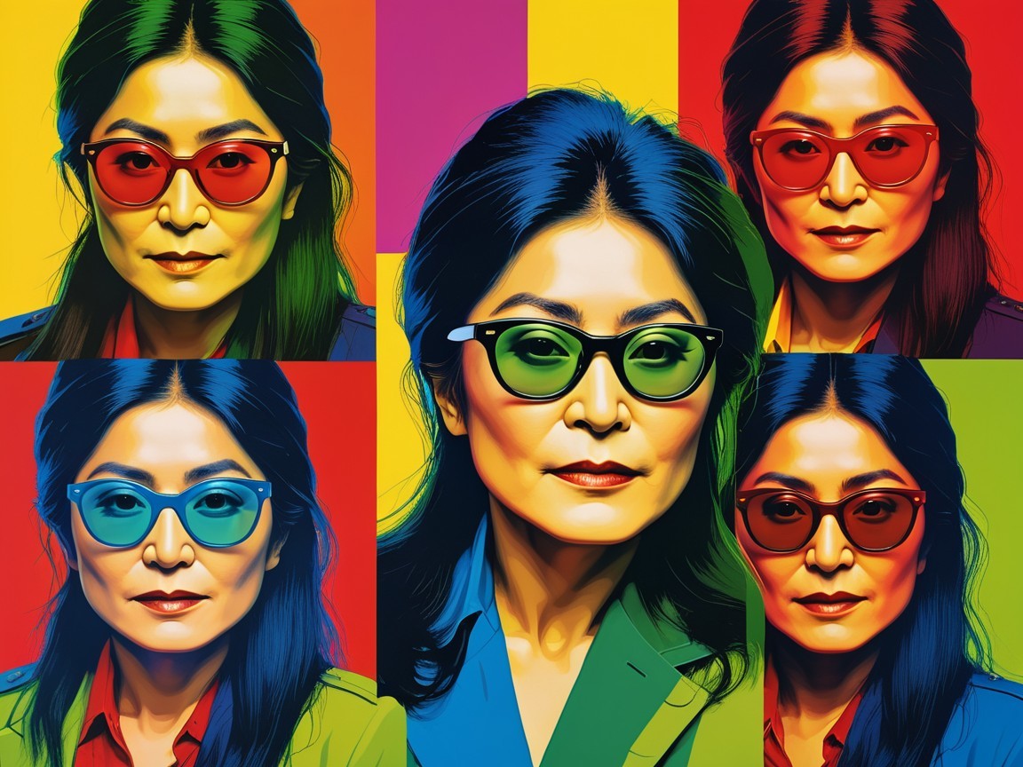 A vibrant pop art collage featuring a woman in colorful sunglasses. Each section showcases her in different hues, with striking expressions against bold, geometric backgrounds.