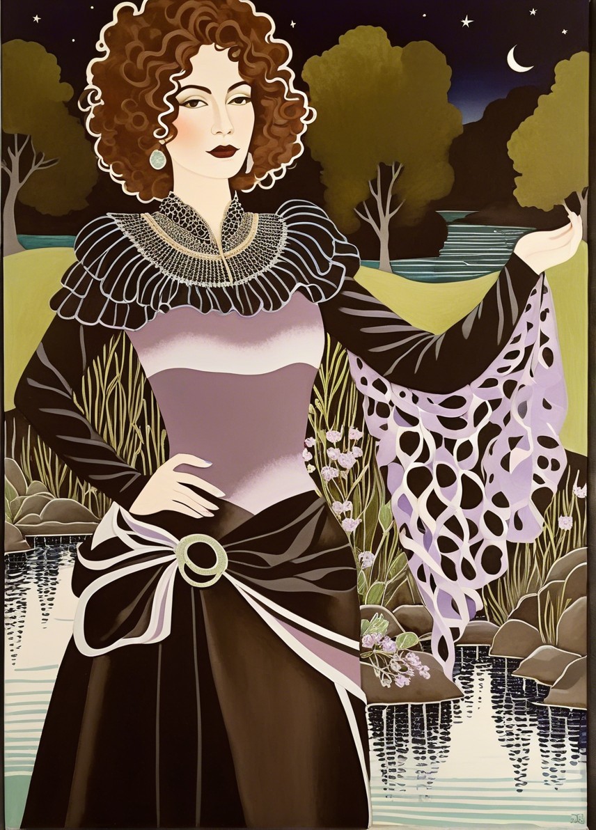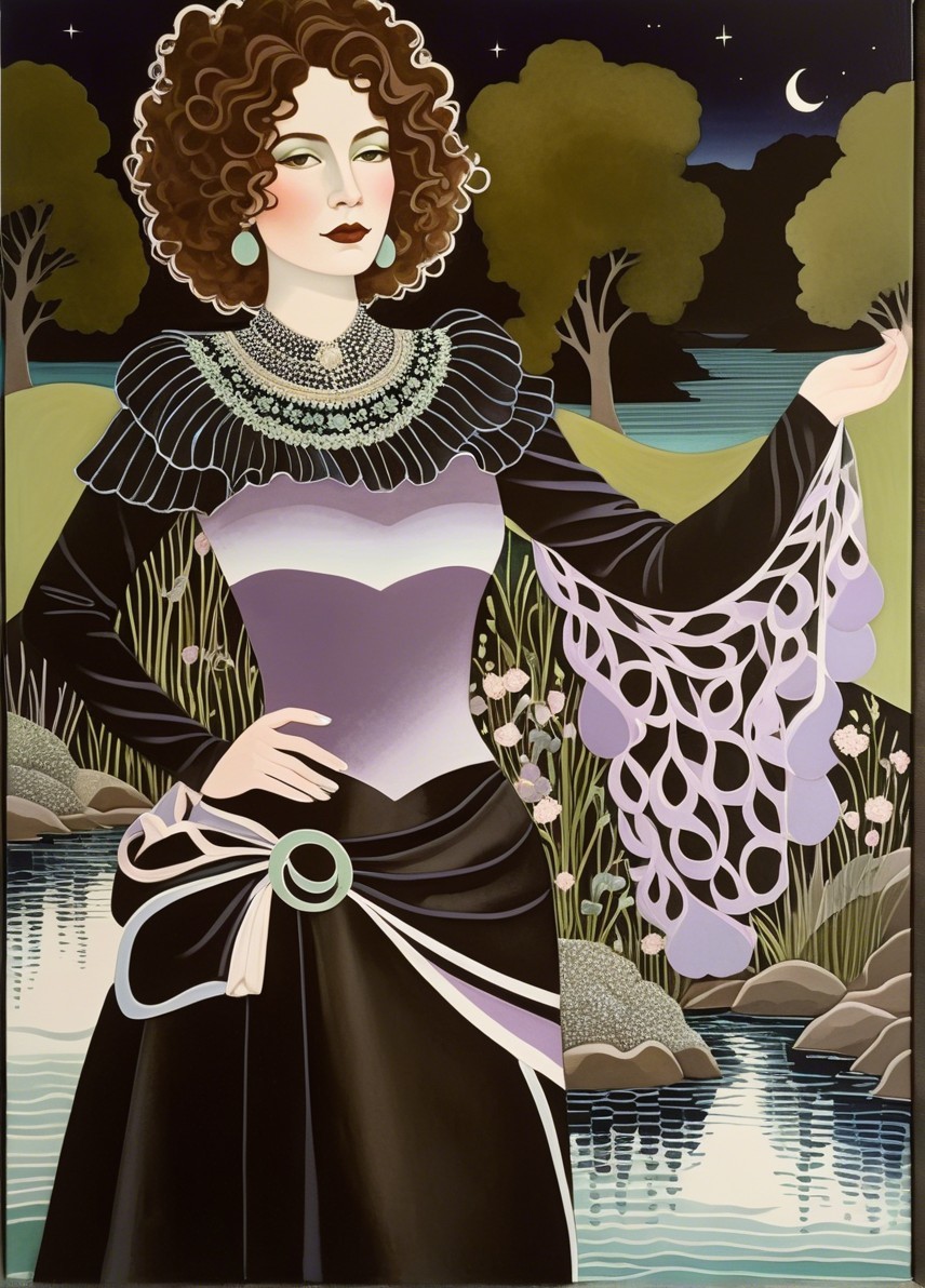 Prompt: Stylized gouache painting by noma bliss, stylized upper body portrait, dreamy enchantress with curly hair and black satin dress with metallic accessories, juvenile, cel-shaded, dethereal, groovy, night time,hues and shades of lavender and pale green, pastel tones of blue and sea-green, dark sky, natural background in acrylic ink, intricate soft pastel color palette, lakeshore setting, only curves, hatching, tessellated style, tiny brush strokes, chromatic induction, vector 9:5, dynamic lighting casting raytraced shadows, dark atmosphere, reminiscent of Overton Loyd, unique aesthetic, otherworldly, back-lit, pop art painting reference, stylization with stacked-up perspective by nicoletta Ceccioli and Gian Lorenzo Bernini, watercolor and ink, colorful portrait in front of riverside, created in patchwork style by Aubrey Bear, reminiscent of abstract art: smooth, impasto tempera, background: tranquil lake, pond weeds, scouring rush, purple loosestrife, reflections on water, misty sunrise, pen and ink in warm tones, three-point lighting, wavery, contouring bold strokes, plasticity effect, detailed, dramatic lighting, pen and ink style of Overton Loyd,.serene, warm color palette, precise Gelsculpt, tonalism, intricate details, calm water, blotting paint with thick strokes, softened rounded edges, high detail, brushed textures in simplistic style, squiggly storybook illustration art by Overton Loyd, tints of freda people and Susan Seddon Boulet, 1970s advertising art merged with Renaissance portrait, hatching, stacked-up perspective, Beautiful artwork, 3 point light reflections, hues, filigree, fine brush strokes in background, artistic precision of ho baron, watercolor and ink extrusion, golden hour, tetradic color scheme reddish-brown beige green ochre, squiggly, colored spaces, american gothic 1.7, parallax occlusion 1.2, octane render, coloring by William Bradley, subtle coloring 1.9, traumacore 1.2, overall composition by Georgia o'keffee and Tim Burton and ho baron,
