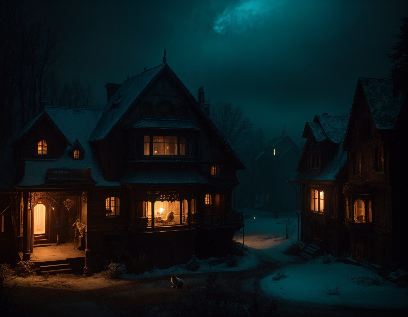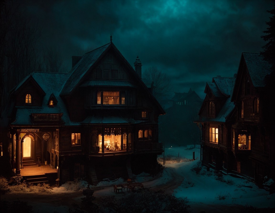 A tranquil night scene depicts a cozy, snow-covered village with warm, glowing windows. Silhouettes of charming houses are surrounded by dark trees and a mysterious, moonlit sky.