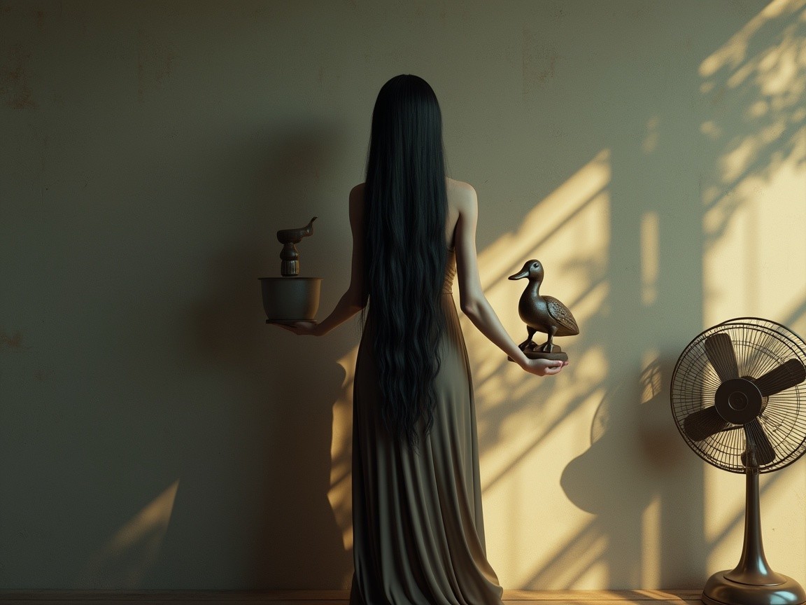A woman with long black hair stands with her back to the viewer, holding a vase in one hand and a duck in the other. Sunlight casts shadows, with a small bird flying nearby and a fan in the background.